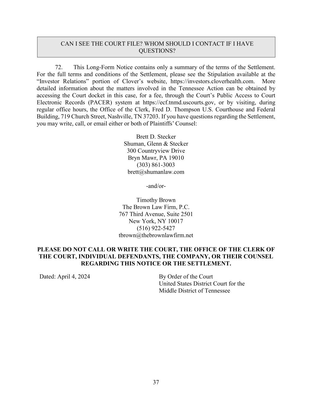 37 CAN I SEE THE COURT FILE? WHOM SHOULD I CONTACT IF I HAVE QUESTIONS? 72. This Long-Form Notice contains only a summary of the terms of the Settlement. For the full terms and conditions of the Settlement, please see the Stipulation available at the “Investor Relations” portion of Clover’s website, https://investors.cloverhealth.com. More detailed information about the matters involved in the Tennessee Action can be obtained by accessing the Court docket in this case, for a fee, through the Court’s Public Access to Court Electronic Records (PACER) system at https://ecf.tnmd.uscourts.gov, or by visiting, during regular office hours, the Office of the Clerk, Fred D. Thompson U.S. Courthouse and Federal Building, 719 Church Street, Nashville, TN 37203. If you have questions regarding the Settlement, you may write, call, or email either or both of Plaintiffs’ Counsel: Brett D. Stecker Shuman, Glenn & Stecker 300 Countryview Drive Bryn Mawr, PA 19010 (303) 861-3003 brett@shumanlaw.com -and/or- Timothy Brown The Brown Law Firm, P.C. 767 Third Avenue, Suite 2501 New York, NY 10017 (516) 922-5427 tbrown@thebrownlawfirm.net PLEASE DO NOT CALL OR WRITE THE COURT, THE OFFICE OF THE CLERK OF THE COURT, INDIVIDUAL DEFENDANTS, THE COMPANY, OR THEIR COUNSEL REGARDING THIS NOTICE OR THE SETTLEMENT. Dated: April 4, 2024 By Order of the Court United States District Court for the Middle District of Tennessee