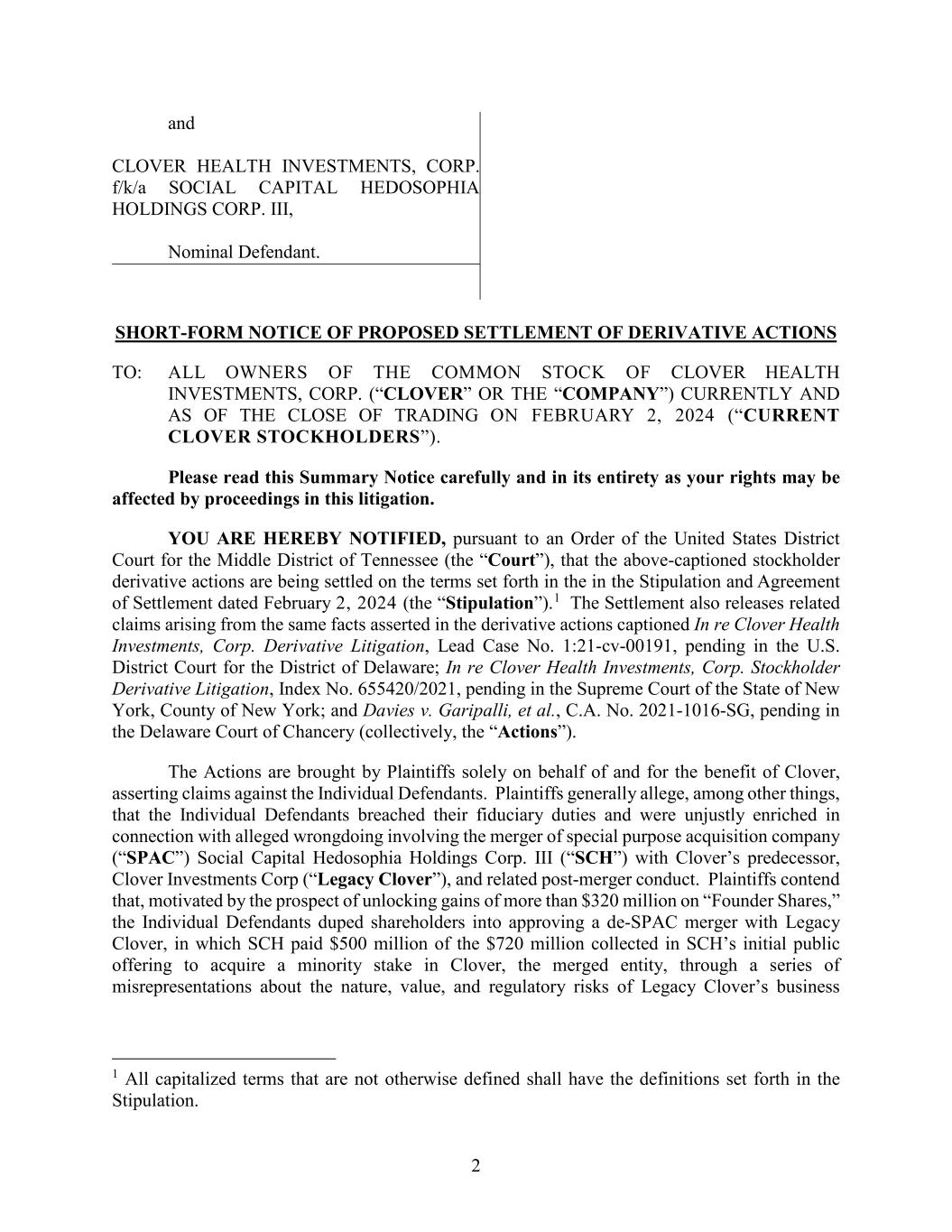 2 and CLOVER HEALTH INVESTMENTS, CORP. f/k/a SOCIAL CAPITAL HEDOSOPHIA HOLDINGS CORP. III, Nominal Defendant. SHORT-FORM NOTICE OF PROPOSED SETTLEMENT OF DERIVATIVE ACTIONS TO: ALL OWNERS OF THE COMMON STOCK OF CLOVER HEALTH INVESTMENTS, CORP. (“CLOVER” OR THE “COMPANY”) CURRENTLY AND AS OF THE CLOSE OF TRADING ON FEBRUARY 2, 2024 (“CURRENT CLOVER STOCKHOLDERS”). Please read this Summary Notice carefully and in its entirety as your rights may be affected by proceedings in this litigation. YOU ARE HEREBY NOTIFIED, pursuant to an Order of the United States District Court for the Middle District of Tennessee (the “Court”), that the above-captioned stockholder derivative actions are being settled on the terms set forth in the in the Stipulation and Agreement of Settlement dated February 2, 2024 (the “Stipulation”).1 The Settlement also releases related claims arising from the same facts asserted in the derivative actions captioned In re Clover Health Investments, Corp. Derivative Litigation, Lead Case No. 1:21-cv-00191, pending in the U.S. District Court for the District of Delaware; In re Clover Health Investments, Corp. Stockholder Derivative Litigation, Index No. 655420/2021, pending in the Supreme Court of the State of New York, County of New York; and Davies v. Garipalli, et al., C.A. No. 2021-1016-SG, pending in the Delaware Court of Chancery (collectively, the “Actions”). The Actions are brought by Plaintiffs solely on behalf of and for the benefit of Clover, asserting claims against the Individual Defendants. Plaintiffs generally allege, among other things, that the Individual Defendants breached their fiduciary duties and were unjustly enriched in connection with alleged wrongdoing involving the merger of special purpose acquisition company (“SPAC”) Social Capital Hedosophia Holdings Corp. III (“SCH”) with Clover’s predecessor, Clover Investments Corp (“Legacy Clover”), and related post-merger conduct. Plaintiffs contend that, motivated by the prospect of unlocking gains of more than $320 million on “Founder Shares,” the Individual Defendants duped shareholders into approving a de-SPAC merger with Legacy Clover, in which SCH paid $500 million of the $720 million collected in SCH’s initial public offering to acquire a minority stake in Clover, the merged entity, through a series of misrepresentations about the nature, value, and regulatory risks of Legacy Clover’s business 1 All capitalized terms that are not otherwise defined shall have the definitions set forth in the Stipulation.