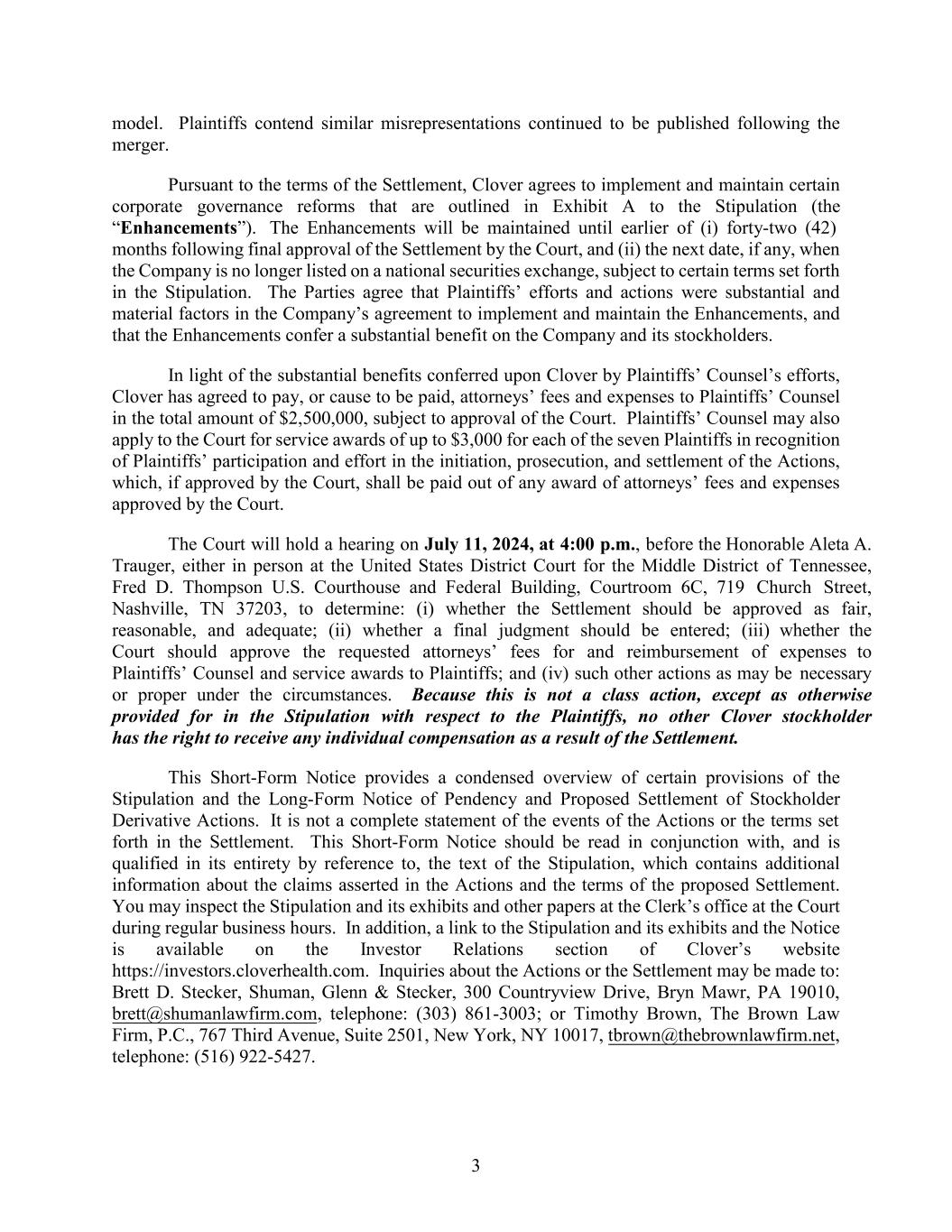 3 model. Plaintiffs contend similar misrepresentations continued to be published following the merger. Pursuant to the terms of the Settlement, Clover agrees to implement and maintain certain corporate governance reforms that are outlined in Exhibit A to the Stipulation (the “Enhancements”). The Enhancements will be maintained until earlier of (i) forty-two (42) months following final approval of the Settlement by the Court, and (ii) the next date, if any, when the Company is no longer listed on a national securities exchange, subject to certain terms set forth in the Stipulation. The Parties agree that Plaintiffs’ efforts and actions were substantial and material factors in the Company’s agreement to implement and maintain the Enhancements, and that the Enhancements confer a substantial benefit on the Company and its stockholders. In light of the substantial benefits conferred upon Clover by Plaintiffs’ Counsel’s efforts, Clover has agreed to pay, or cause to be paid, attorneys’ fees and expenses to Plaintiffs’ Counsel in the total amount of $2,500,000, subject to approval of the Court. Plaintiffs’ Counsel may also apply to the Court for service awards of up to $3,000 for each of the seven Plaintiffs in recognition of Plaintiffs’ participation and effort in the initiation, prosecution, and settlement of the Actions, which, if approved by the Court, shall be paid out of any award of attorneys’ fees and expenses approved by the Court. The Court will hold a hearing on July 11, 2024, at 4:00 p.m., before the Honorable Aleta A. Trauger, either in person at the United States District Court for the Middle District of Tennessee, Fred D. Thompson U.S. Courthouse and Federal Building, Courtroom 6C, 719 Church Street, Nashville, TN 37203, to determine: (i) whether the Settlement should be approved as fair, reasonable, and adequate; (ii) whether a final judgment should be entered; (iii) whether the Court should approve the requested attorneys’ fees for and reimbursement of expenses to Plaintiffs’ Counsel and service awards to Plaintiffs; and (iv) such other actions as may be necessary or proper under the circumstances. Because this is not a class action, except as otherwise provided for in the Stipulation with respect to the Plaintiffs, no other Clover stockholder has the right to receive any individual compensation as a result of the Settlement. This Short-Form Notice provides a condensed overview of certain provisions of the Stipulation and the Long-Form Notice of Pendency and Proposed Settlement of Stockholder Derivative Actions. It is not a complete statement of the events of the Actions or the terms set forth in the Settlement. This Short-Form Notice should be read in conjunction with, and is qualified in its entirety by reference to, the text of the Stipulation, which contains additional information about the claims asserted in the Actions and the terms of the proposed Settlement. You may inspect the Stipulation and its exhibits and other papers at the Clerk’s office at the Court during regular business hours. In addition, a link to the Stipulation and its exhibits and the Notice is available on the Investor Relations section of Clover’s website https://investors.cloverhealth.com. Inquiries about the Actions or the Settlement may be made to: Brett D. Stecker, Shuman, Glenn & Stecker, 300 Countryview Drive, Bryn Mawr, PA 19010, brett@shumanlawfirm.com, telephone: (303) 861-3003; or Timothy Brown, The Brown Law Firm, P.C., 767 Third Avenue, Suite 2501, New York, NY 10017, tbrown@thebrownlawfirm.net, telephone: (516) 922-5427.