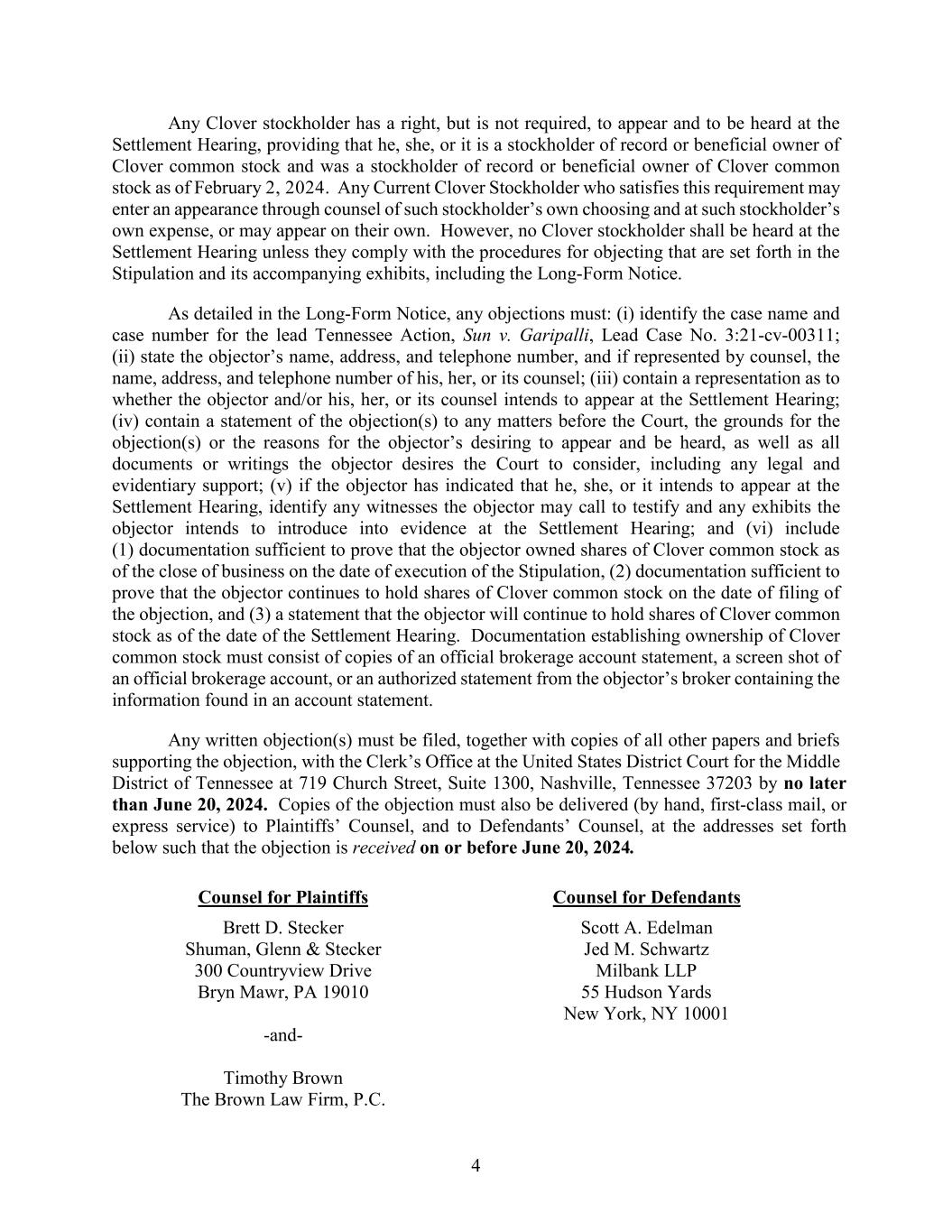 35 (iii) determine whether of the agreed-to attorneys’ fees and expenses to Plaintiffs’ Counsel should be approved; and (iv) rule on such other matters as the Court may deem appropriate. 64. Any Current Clover Stockholder who continues to own shares of Clover common stock through the date of the Settlement Hearing may object to the Settlement and/or of the requested attorneys’ fees and expenses to Plaintiffs’ Counsel. Objections must be signed and in writing. You must file any written objection, together with copies of all other papers and briefs supporting the objection, with the Clerk’s Office at the United States District Court for the Middle District of Tennessee at the address set forth below no later than June 20, 2024. Copies of the objection must also be delivered (by hand, first-class mail, or express service) to Tennessee Plaintiffs’ Counsel, and to Defendants’ Counsel, at the addresses set forth below such that the objection is received on or before June 20, 2024. Clerk’s Office Office of the Clerk Fred D. Thompson U.S. Courthouse and Federal Building 719 Church Street, Suite 1300 Nashville, TN 37203 Counsel for Defendants Scott A. Edelman Jed M. Schwartz Milbank LLP 55 Hudson Yards New York, NY 10001 Counsel for Plaintiffs Brett D. Stecker Shuman, Glenn & Stecker 300 Countryview Drive Bryn Mawr, PA 19010 -and- Timothy Brown The Brown Law Firm, P.C. 767 Third Avenue, Suite 2501 New York, NY 10017 Counsel for Defendants Scott A. Edelman Jed M. Schwartz Milbank LLP 55 Hudson Yards New York, NY 10001 65. Any objections must: (i) identify the case name and case number for the lead Tennessee Action, Sun v. Garipalli, Lead Case No. 3:21-cv-00311; (ii) state the objector’s name, address, and telephone number, and if represented by counsel, the name, address, and telephone number of his, her, or its counsel; (iii) contain a representation as to whether the objector and/or his, her, or its counsel intends to appear at the Settlement Hearing; (iv) contain a statement of the objection(s) to any matters before the Court, the grounds for the objection(s) or the reasons for the objector’s desiring to appear and be heard, as well as all documents or writings the objector desires the Court to consider, including any legal and evidentiary support; (v) if the objector has indicated that he, she, or it intends to appear at the Settlement Hearing, identify any witnesses the objector may call to testify and any exhibits the objector intends to introduce into evidence at the Settlement Hearing; and (vi) include: (1) documentation sufficient to prove that the objector owned shares of Clover common stock as of the close of business on the date of execution of the Stipulation,