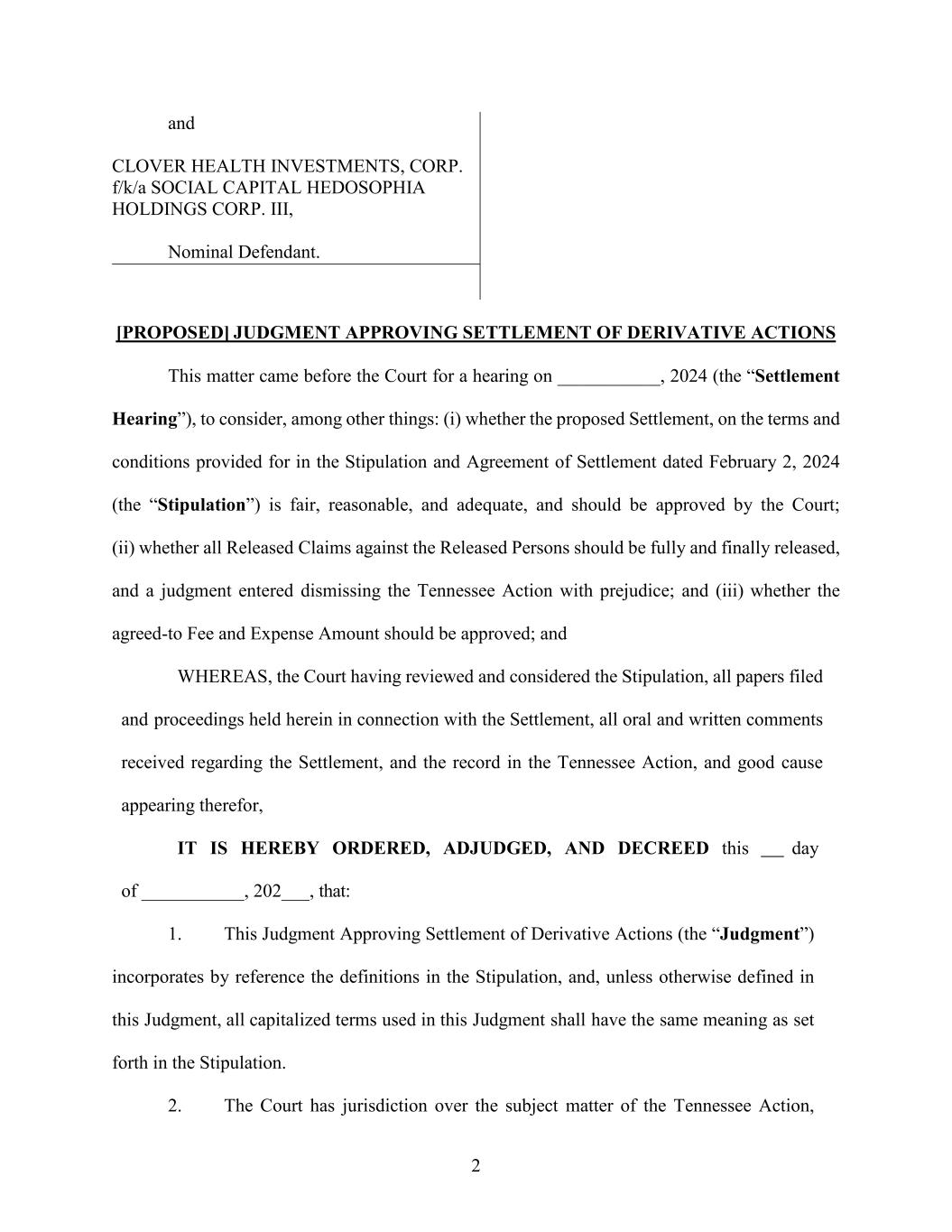 2 and CLOVER HEALTH INVESTMENTS, CORP. f/k/a SOCIAL CAPITAL HEDOSOPHIA HOLDINGS CORP. III, Nominal Defendant. [PROPOSED] JUDGMENT APPROVING SETTLEMENT OF DERIVATIVE ACTIONS This matter came before the Court for a hearing on ___________, 2024 (the “Settlement Hearing”), to consider, among other things: (i) whether the proposed Settlement, on the terms and conditions provided for in the Stipulation and Agreement of Settlement dated February 2, 2024 (the “Stipulation”) is fair, reasonable, and adequate, and should be approved by the Court; (ii) whether all Released Claims against the Released Persons should be fully and finally released, and a judgment entered dismissing the Tennessee Action with prejudice; and (iii) whether the agreed-to Fee and Expense Amount should be approved; and WHEREAS, the Court having reviewed and considered the Stipulation, all papers filed and proceedings held herein in connection with the Settlement, all oral and written comments received regarding the Settlement, and the record in the Tennessee Action, and good cause appearing therefor, IT IS HEREBY ORDERED, ADJUDGED, AND DECREED this day of ___________, 202___, that: 1. This Judgment Approving Settlement of Derivative Actions (the “Judgment”) incorporates by reference the definitions in the Stipulation, and, unless otherwise defined in this Judgment, all capitalized terms used in this Judgment shall have the same meaning as set forth in the Stipulation. 2. The Court has jurisdiction over the subject matter of the Tennessee Action,
