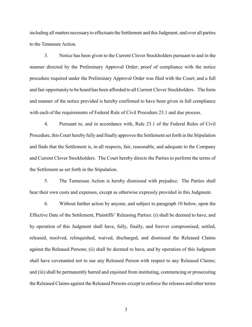 3 including all matters necessary to effectuate the Settlement and this Judgment, and over all parties to the Tennessee Action. 3. Notice has been given to the Current Clover Stockholders pursuant to and in the manner directed by the Preliminary Approval Order; proof of compliance with the notice procedure required under the Preliminary Approval Order was filed with the Court; and a full and fair opportunity to be heard has been afforded to all Current Clover Stockholders. The form and manner of the notice provided is hereby confirmed to have been given in full compliance with each of the requirements of Federal Rule of Civil Procedure 23.1 and due process. 4. Pursuant to, and in accordance with, Rule 23.1 of the Federal Rules of Civil Procedure, this Court hereby fully and finally approves the Settlement set forth in the Stipulation and finds that the Settlement is, in all respects, fair, reasonable, and adequate to the Company and Current Clover Stockholders. The Court hereby directs the Parties to perform the terms of the Settlement as set forth in the Stipulation. 5. The Tennessee Action is hereby dismissed with prejudice. The Parties shall bear their own costs and expenses, except as otherwise expressly provided in this Judgment. 6. Without further action by anyone, and subject to paragraph 10 below, upon the Effective Date of the Settlement, Plaintiffs’ Releasing Parties: (i) shall be deemed to have, and by operation of this Judgment shall have, fully, finally, and forever compromised, settled, released, resolved, relinquished, waived, discharged, and dismissed the Released Claims against the Released Persons; (ii) shall be deemed to have, and by operation of this Judgment shall have covenanted not to sue any Released Person with respect to any Released Claims; and (iii) shall be permanently barred and enjoined from instituting, commencing or prosecuting the Released Claims against the Released Persons except to enforce the releases and other terms
