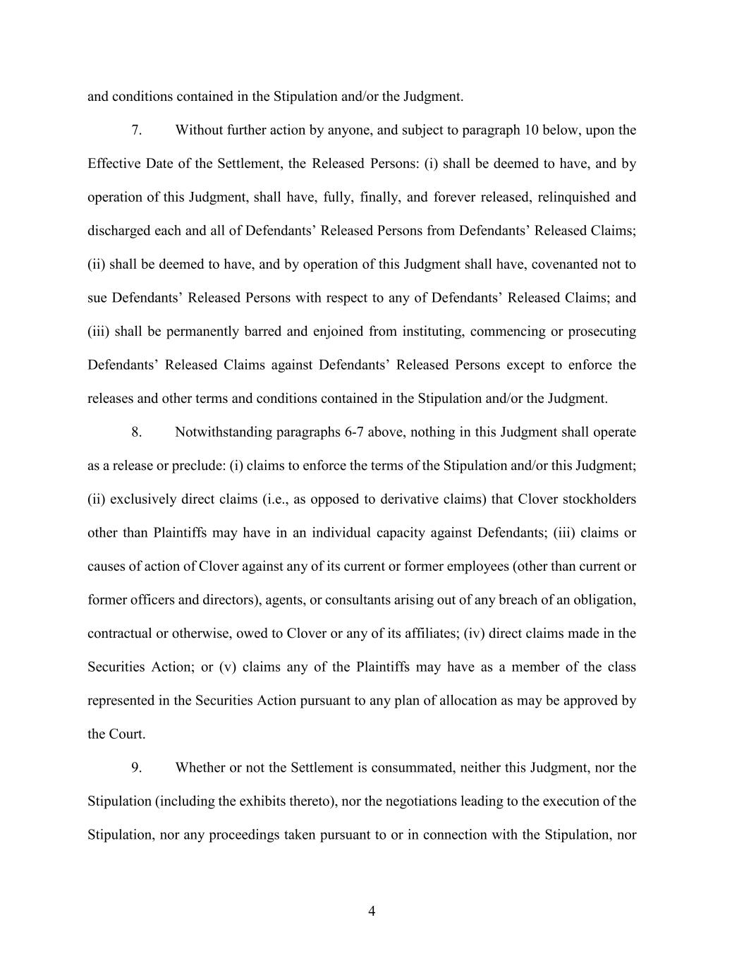 4 and conditions contained in the Stipulation and/or the Judgment. 7. Without further action by anyone, and subject to paragraph 10 below, upon the Effective Date of the Settlement, the Released Persons: (i) shall be deemed to have, and by operation of this Judgment, shall have, fully, finally, and forever released, relinquished and discharged each and all of Defendants’ Released Persons from Defendants’ Released Claims; (ii) shall be deemed to have, and by operation of this Judgment shall have, covenanted not to sue Defendants’ Released Persons with respect to any of Defendants’ Released Claims; and (iii) shall be permanently barred and enjoined from instituting, commencing or prosecuting Defendants’ Released Claims against Defendants’ Released Persons except to enforce the releases and other terms and conditions contained in the Stipulation and/or the Judgment. 8. Notwithstanding paragraphs 6-7 above, nothing in this Judgment shall operate as a release or preclude: (i) claims to enforce the terms of the Stipulation and/or this Judgment; (ii) exclusively direct claims (i.e., as opposed to derivative claims) that Clover stockholders other than Plaintiffs may have in an individual capacity against Defendants; (iii) claims or causes of action of Clover against any of its current or former employees (other than current or former officers and directors), agents, or consultants arising out of any breach of an obligation, contractual or otherwise, owed to Clover or any of its affiliates; (iv) direct claims made in the Securities Action; or (v) claims any of the Plaintiffs may have as a member of the class represented in the Securities Action pursuant to any plan of allocation as may be approved by the Court. 9. Whether or not the Settlement is consummated, neither this Judgment, nor the Stipulation (including the exhibits thereto), nor the negotiations leading to the execution of the Stipulation, nor any proceedings taken pursuant to or in connection with the Stipulation, nor