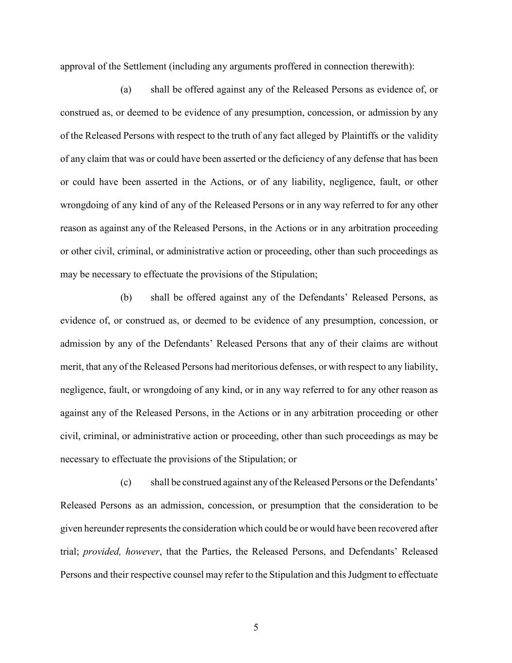 5 approval of the Settlement (including any arguments proffered in connection therewith): (a) shall be offered against any of the Released Persons as evidence of, or construed as, or deemed to be evidence of any presumption, concession, or admission by any of the Released Persons with respect to the truth of any fact alleged by Plaintiffs or the validity of any claim that was or could have been asserted or the deficiency of any defense that has been or could have been asserted in the Actions, or of any liability, negligence, fault, or other wrongdoing of any kind of any of the Released Persons or in any way referred to for any other reason as against any of the Released Persons, in the Actions or in any arbitration proceeding or other civil, criminal, or administrative action or proceeding, other than such proceedings as may be necessary to effectuate the provisions of the Stipulation; (b) shall be offered against any of the Defendants’ Released Persons, as evidence of, or construed as, or deemed to be evidence of any presumption, concession, or admission by any of the Defendants’ Released Persons that any of their claims are without merit, that any of the Released Persons had meritorious defenses, or with respect to any liability, negligence, fault, or wrongdoing of any kind, or in any way referred to for any other reason as against any of the Released Persons, in the Actions or in any arbitration proceeding or other civil, criminal, or administrative action or proceeding, other than such proceedings as may be necessary to effectuate the provisions of the Stipulation; or (c) shall be construed against any of the Released Persons or the Defendants’ Released Persons as an admission, concession, or presumption that the consideration to be given hereunder represents the consideration which could be or would have been recovered after trial; provided, however, that the Parties, the Released Persons, and Defendants’ Released Persons and their respective counsel may refer to the Stipulation and this Judgment to effectuate