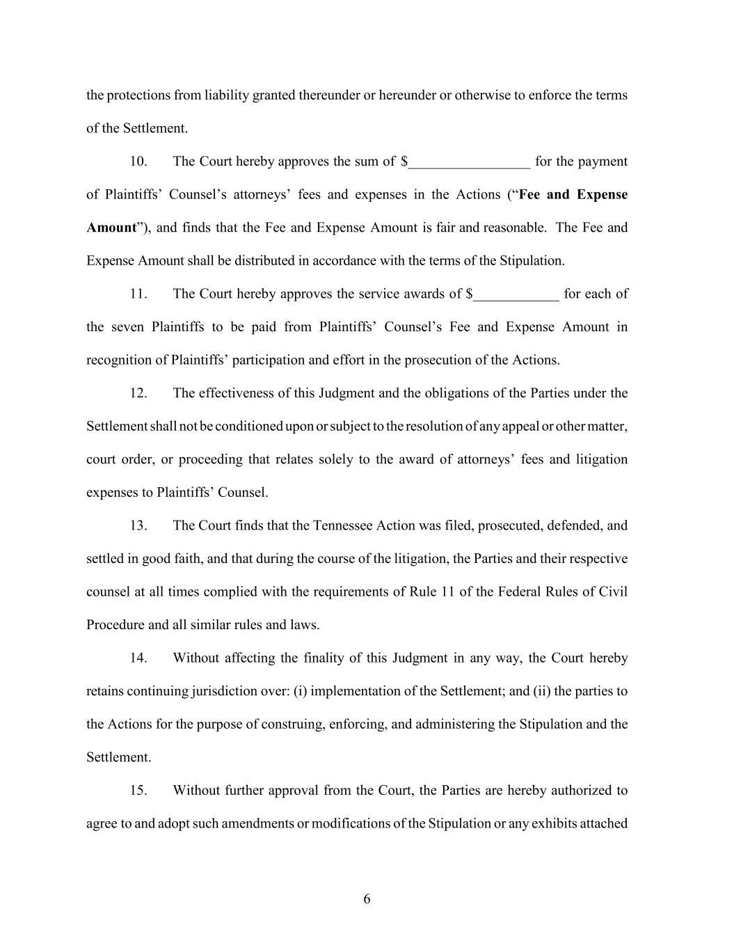 6 the protections from liability granted thereunder or hereunder or otherwise to enforce the terms of the Settlement. 10. The Court hereby approves the sum of $_________________ for the payment of Plaintiffs’ Counsel’s attorneys’ fees and expenses in the Actions (“Fee and Expense Amount”), and finds that the Fee and Expense Amount is fair and reasonable. The Fee and Expense Amount shall be distributed in accordance with the terms of the Stipulation. 11. The Court hereby approves the service awards of $____________ for each of the seven Plaintiffs to be paid from Plaintiffs’ Counsel’s Fee and Expense Amount in recognition of Plaintiffs’ participation and effort in the prosecution of the Actions. 12. The effectiveness of this Judgment and the obligations of the Parties under the Settlement shall not be conditioned upon or subject to the resolution of any appeal or other matter, court order, or proceeding that relates solely to the award of attorneys’ fees and litigation expenses to Plaintiffs’ Counsel. 13. The Court finds that the Tennessee Action was filed, prosecuted, defended, and settled in good faith, and that during the course of the litigation, the Parties and their respective counsel at all times complied with the requirements of Rule 11 of the Federal Rules of Civil Procedure and all similar rules and laws. 14. Without affecting the finality of this Judgment in any way, the Court hereby retains continuing jurisdiction over: (i) implementation of the Settlement; and (ii) the parties to the Actions for the purpose of construing, enforcing, and administering the Stipulation and the Settlement. 15. Without further approval from the Court, the Parties are hereby authorized to agree to and adopt such amendments or modifications of the Stipulation or any exhibits attached