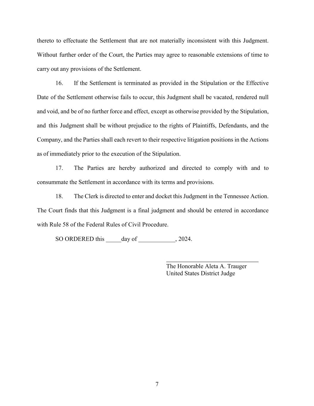 7 thereto to effectuate the Settlement that are not materially inconsistent with this Judgment. Without further order of the Court, the Parties may agree to reasonable extensions of time to carry out any provisions of the Settlement. 16. If the Settlement is terminated as provided in the Stipulation or the Effective Date of the Settlement otherwise fails to occur, this Judgment shall be vacated, rendered null and void, and be of no further force and effect, except as otherwise provided by the Stipulation, and this Judgment shall be without prejudice to the rights of Plaintiffs, Defendants, and the Company, and the Parties shall each revert to their respective litigation positions in the Actions as of immediately prior to the execution of the Stipulation. 17. The Parties are hereby authorized and directed to comply with and to consummate the Settlement in accordance with its terms and provisions. 18. The Clerk is directed to enter and docket this Judgment in the Tennessee Action. The Court finds that this Judgment is a final judgment and should be entered in accordance with Rule 58 of the Federal Rules of Civil Procedure. SO ORDERED this _____day of ____________, 2024. The Honorable Aleta A. Trauger United States District Judge