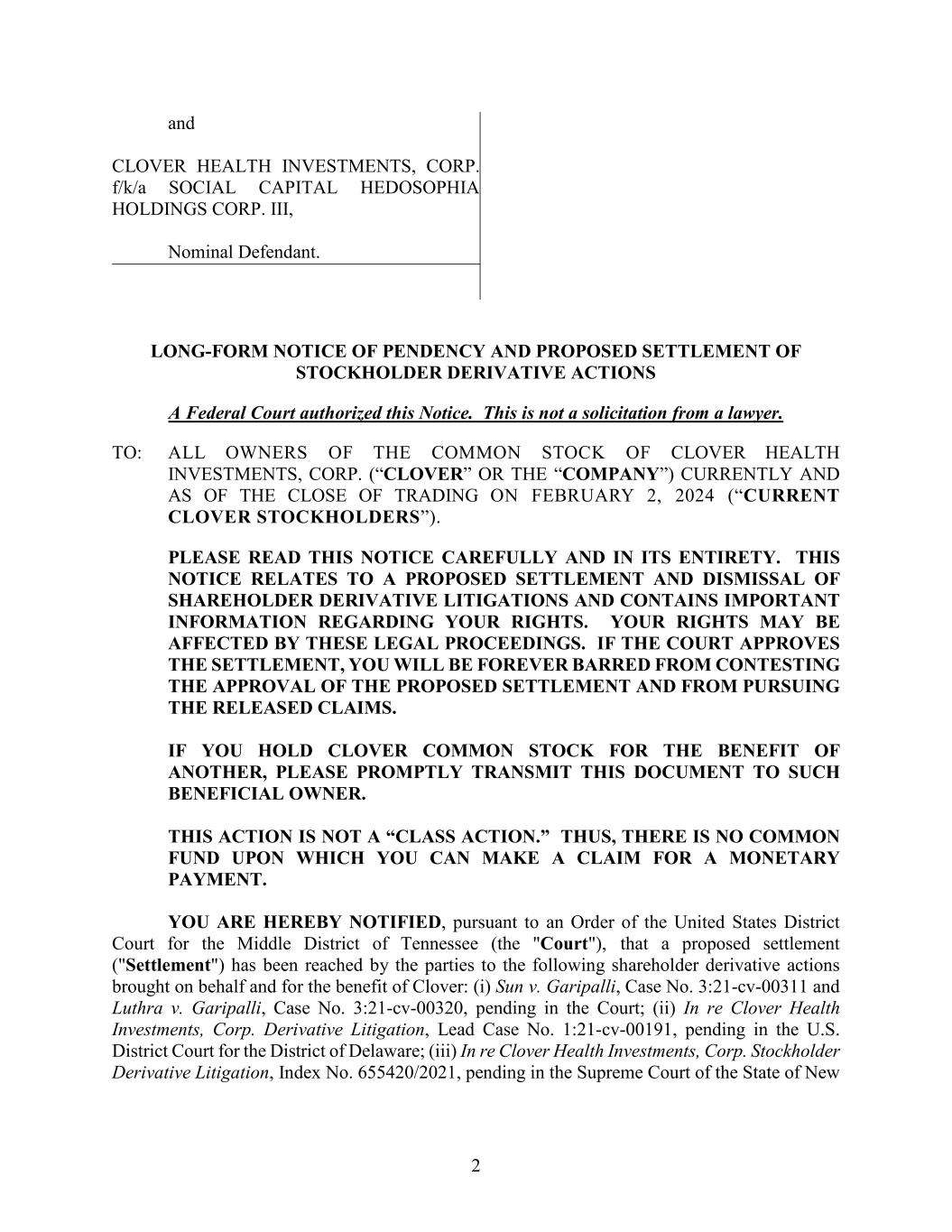 2 and CLOVER HEALTH INVESTMENTS, CORP. f/k/a SOCIAL CAPITAL HEDOSOPHIA HOLDINGS CORP. III, Nominal Defendant. LONG-FORM NOTICE OF PENDENCY AND PROPOSED SETTLEMENT OF STOCKHOLDER DERIVATIVE ACTIONS A Federal Court authorized this Notice. This is not a solicitation from a lawyer. TO: ALL OWNERS OF THE COMMON STOCK OF CLOVER HEALTH INVESTMENTS, CORP. (“CLOVER” OR THE “COMPANY”) CURRENTLY AND AS OF THE CLOSE OF TRADING ON FEBRUARY 2, 2024 (“CURRENT CLOVER STOCKHOLDERS”). PLEASE READ THIS NOTICE CAREFULLY AND IN ITS ENTIRETY. THIS NOTICE RELATES TO A PROPOSED SETTLEMENT AND DISMISSAL OF SHAREHOLDER DERIVATIVE LITIGATIONS AND CONTAINS IMPORTANT INFORMATION REGARDING YOUR RIGHTS. YOUR RIGHTS MAY BE AFFECTED BY THESE LEGAL PROCEEDINGS. IF THE COURT APPROVES THE SETTLEMENT, YOU WILL BE FOREVER BARRED FROM CONTESTING THE APPROVAL OF THE PROPOSED SETTLEMENT AND FROM PURSUING THE RELEASED CLAIMS. IF YOU HOLD CLOVER COMMON STOCK FOR THE BENEFIT OF ANOTHER, PLEASE PROMPTLY TRANSMIT THIS DOCUMENT TO SUCH BENEFICIAL OWNER. THIS ACTION IS NOT A “CLASS ACTION.” THUS, THERE IS NO COMMON FUND UPON WHICH YOU CAN MAKE A CLAIM FOR A MONETARY PAYMENT. YOU ARE HEREBY NOTIFIED, pursuant to an Order of the United States District Court for the Middle District of Tennessee (the "Court"), that a proposed settlement ("Settlement") has been reached by the parties to the following shareholder derivative actions brought on behalf and for the benefit of Clover: (i) Sun v. Garipalli, Case No. 3:21-cv-00311 and Luthra v. Garipalli, Case No. 3:21-cv-00320, pending in the Court; (ii) In re Clover Health Investments, Corp. Derivative Litigation, Lead Case No. 1:21-cv-00191, pending in the U.S. District Court for the District of Delaware; (iii) In re Clover Health Investments, Corp. Stockholder Derivative Litigation, Index No. 655420/2021, pending in the Supreme Court of the State of New