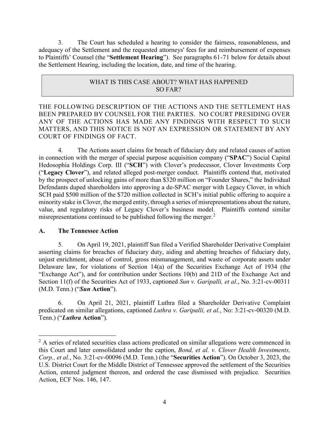 4 3. The Court has scheduled a hearing to consider the fairness, reasonableness, and adequacy of the Settlement and the requested attorneys' fees for and reimbursement of expenses to Plaintiffs’ Counsel (the “Settlement Hearing”). See paragraphs 61-71 below for details about the Settlement Hearing, including the location, date, and time of the hearing. WHAT IS THIS CASE ABOUT? WHAT HAS HAPPENED SO FAR? THE FOLLOWING DESCRIPTION OF THE ACTIONS AND THE SETTLEMENT HAS BEEN PREPARED BY COUNSEL FOR THE PARTIES. NO COURT PRESIDING OVER ANY OF THE ACTIONS HAS MADE ANY FINDINGS WITH RESPECT TO SUCH MATTERS, AND THIS NOTICE IS NOT AN EXPRESSION OR STATEMENT BY ANY COURT OF FINDINGS OF FACT. 4. The Actions assert claims for breach of fiduciary duty and related causes of action in connection with the merger of special purpose acquisition company (“SPAC”) Social Capital Hedosophia Holdings Corp. III (“SCH”) with Clover’s predecessor, Clover Investments Corp (“Legacy Clover”), and related alleged post-merger conduct. Plaintiffs contend that, motivated by the prospect of unlocking gains of more than $320 million on “Founder Shares,” the Individual Defendants duped shareholders into approving a de-SPAC merger with Legacy Clover, in which SCH paid $500 million of the $720 million collected in SCH’s initial public offering to acquire a minority stake in Clover, the merged entity, through a series of misrepresentations about the nature, value, and regulatory risks of Legacy Clover’s business model. Plaintiffs contend similar misrepresentations continued to be published following the merger.2 A. The Tennessee Action 5. On April 19, 2021, plaintiff Sun filed a Verified Shareholder Derivative Complaint asserting claims for breaches of fiduciary duty, aiding and abetting breaches of fiduciary duty, unjust enrichment, abuse of control, gross mismanagement, and waste of corporate assets under Delaware law, for violations of Section 14(a) of the Securities Exchange Act of 1934 (the “Exchange Act”), and for contribution under Sections 10(b) and 21D of the Exchange Act and Section 11(f) of the Securities Act of 1933, captioned Sun v. Garipalli, et al., No. 3:21-cv-00311 (M.D. Tenn.) (“Sun Action”). 6. On April 21, 2021, plaintiff Luthra filed a Shareholder Derivative Complaint predicated on similar allegations, captioned Luthra v. Garipalli, et al., No: 3:21-cv-00320 (M.D. Tenn.) (“Luthra Action”). 2 A series of related securities class actions predicated on similar allegations were commenced in this Court and later consolidated under the caption, Bond, et al. v. Clover Health Investments, Corp., et al., No. 3:21-cv-00096 (M.D. Tenn.) (the “Securities Action”). On October 3, 2023, the U.S. District Court for the Middle District of Tennessee approved the settlement of the Securities Action, entered judgment thereon, and ordered the case dismissed with prejudice. Securities Action, ECF Nos. 146, 147.