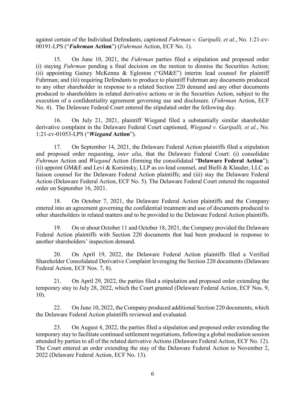 6 against certain of the Individual Defendants, captioned Fuhrman v. Garipalli, et al., No. 1:21-cv- 00191-LPS (“Fuhrman Action”) (Fuhrman Action, ECF No. 1). 15. On June 10, 2021, the Fuhrman parties filed a stipulation and proposed order (i) staying Fuhrman pending a final decision on the motion to dismiss the Securities Action; (ii) appointing Gainey McKenna & Egleston (“GM&E”) interim lead counsel for plaintiff Fuhrman; and (iii) requiring Defendants to produce to plaintiff Fuhrman any documents produced to any other shareholder in response to a related Section 220 demand and any other documents produced to shareholders in related derivative actions or in the Securities Action, subject to the execution of a confidentiality agreement governing use and disclosure. (Fuhrman Action, ECF No. 4). The Delaware Federal Court entered the stipulated order the following day. 16. On July 21, 2021, plaintiff Wiegand filed a substantially similar shareholder derivative complaint in the Delaware Federal Court captioned, Wiegand v. Garipalli, et al., No. 1:21-cv-01053-LPS (“Wiegand Action”). 17. On September 14, 2021, the Delaware Federal Action plaintiffs filed a stipulation and proposed order requesting, inter alia, that the Delaware Federal Court: (i) consolidate Fuhrman Action and Wiegand Action (forming the consolidated “Delaware Federal Action”); (ii) appoint GM&E and Levi & Korsinsky, LLP as co-lead counsel, and Bielli & Klauder, LLC as liaison counsel for the Delaware Federal Action plaintiffs; and (iii) stay the Delaware Federal Action (Delaware Federal Action, ECF No. 5). The Delaware Federal Court entered the requested order on September 16, 2021. 18. On October 7, 2021, the Delaware Federal Action plaintiffs and the Company entered into an agreement governing the confidential treatment and use of documents produced to other shareholders in related matters and to be provided to the Delaware Federal Action plaintiffs. 19. On or about October 11 and October 18, 2021, the Company provided the Delaware Federal Action plaintiffs with Section 220 documents that had been produced in response to another shareholders’ inspection demand. 20. On April 19, 2022, the Delaware Federal Action plaintiffs filed a Verified Shareholder Consolidated Derivative Complaint leveraging the Section 220 documents (Delaware Federal Action, ECF Nos. 7, 8). 21. On April 29, 2022, the parties filed a stipulation and proposed order extending the temporary stay to July 28, 2022, which the Court granted (Delaware Federal Action, ECF Nos. 9, 10). 22. On June 10, 2022, the Company produced additional Section 220 documents, which the Delaware Federal Action plaintiffs reviewed and evaluated. 23. On August 4, 2022, the parties filed a stipulation and proposed order extending the temporary stay to facilitate continued settlement negotiations, following a global mediation session attended by parties to all of the related derivative Actions (Delaware Federal Action, ECF No. 12). The Court entered an order extending the stay of the Delaware Federal Action to November 2, 2022 (Delaware Federal Action, ECF No. 13).