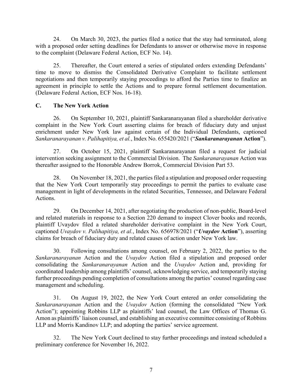 7 24. On March 30, 2023, the parties filed a notice that the stay had terminated, along with a proposed order setting deadlines for Defendants to answer or otherwise move in response to the complaint (Delaware Federal Action, ECF No. 14). 25. Thereafter, the Court entered a series of stipulated orders extending Defendants’ time to move to dismiss the Consolidated Derivative Complaint to facilitate settlement negotiations and then temporarily staying proceedings to afford the Parties time to finalize an agreement in principle to settle the Actions and to prepare formal settlement documentation. (Delaware Federal Action, ECF Nos. 16-18). C. The New York Action 26. On September 10, 2021, plaintiff Sankaranarayanan filed a shareholder derivative complaint in the New York Court asserting claims for breach of fiduciary duty and unjust enrichment under New York law against certain of the Individual Defendants, captioned Sankaranarayanan v. Palihapitiya, et al., Index No. 655420/2021 (“Sankaranarayanan Action”). 27. On October 15, 2021, plaintiff Sankaranarayanan filed a request for judicial intervention seeking assignment to the Commercial Division. The Sankaranarayanan Action was thereafter assigned to the Honorable Andrew Borrok, Commercial Division Part 53. 28. On November 18, 2021, the parties filed a stipulation and proposed order requesting that the New York Court temporarily stay proceedings to permit the parties to evaluate case management in light of developments in the related Securities, Tennessee, and Delaware Federal Actions. 29. On December 14, 2021, after negotiating the production of non-public, Board-level and related materials in response to a Section 220 demand to inspect Clover books and records, plaintiff Uvaydov filed a related shareholder derivative complaint in the New York Court, captioned Uvaydov v. Palihapitiya, et al., Index No. 656978/2021 (“Uvaydov Action”), asserting claims for breach of fiduciary duty and related causes of action under New York law. 30. Following consultations among counsel, on February 2, 2022, the parties to the Sankaranarayanan Action and the Uvaydov Action filed a stipulation and proposed order consolidating the Sankaranarayanan Action and the Uvaydov Action and, providing for coordinated leadership among plaintiffs’ counsel, acknowledging service, and temporarily staying further proceedings pending completion of consultations among the parties’ counsel regarding case management and scheduling. 31. On August 19, 2022, the New York Court entered an order consolidating the Sankaranarayanan Action and the Uvaydov Action (forming the consolidated “New York Action”); appointing Robbins LLP as plaintiffs’ lead counsel, the Law Offices of Thomas G. Amon as plaintiffs’ liaison counsel, and establishing an executive committee consisting of Robbins LLP and Morris Kandinov LLP; and adopting the parties’ service agreement. 32. The New York Court declined to stay further proceedings and instead scheduled a preliminary conference for November 16, 2022.