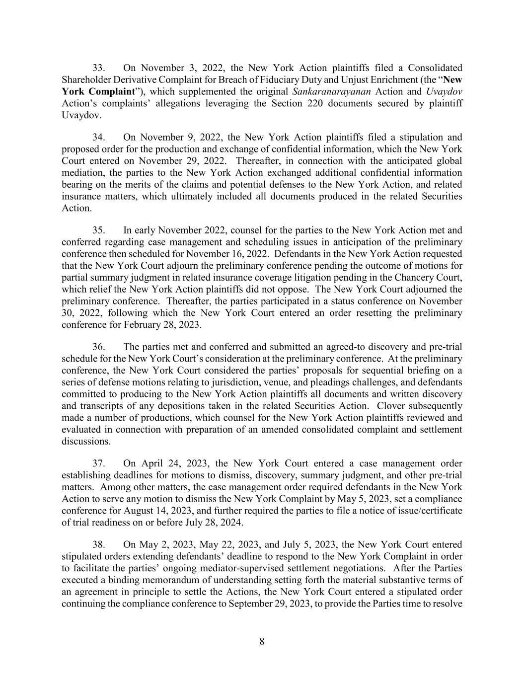 8 33. On November 3, 2022, the New York Action plaintiffs filed a Consolidated Shareholder Derivative Complaint for Breach of Fiduciary Duty and Unjust Enrichment (the “New York Complaint”), which supplemented the original Sankaranarayanan Action and Uvaydov Action’s complaints’ allegations leveraging the Section 220 documents secured by plaintiff Uvaydov. 34. On November 9, 2022, the New York Action plaintiffs filed a stipulation and proposed order for the production and exchange of confidential information, which the New York Court entered on November 29, 2022. Thereafter, in connection with the anticipated global mediation, the parties to the New York Action exchanged additional confidential information bearing on the merits of the claims and potential defenses to the New York Action, and related insurance matters, which ultimately included all documents produced in the related Securities Action. 35. In early November 2022, counsel for the parties to the New York Action met and conferred regarding case management and scheduling issues in anticipation of the preliminary conference then scheduled for November 16, 2022. Defendants in the New York Action requested that the New York Court adjourn the preliminary conference pending the outcome of motions for partial summary judgment in related insurance coverage litigation pending in the Chancery Court, which relief the New York Action plaintiffs did not oppose. The New York Court adjourned the preliminary conference. Thereafter, the parties participated in a status conference on November 30, 2022, following which the New York Court entered an order resetting the preliminary conference for February 28, 2023. 36. The parties met and conferred and submitted an agreed-to discovery and pre-trial schedule for the New York Court’s consideration at the preliminary conference. At the preliminary conference, the New York Court considered the parties’ proposals for sequential briefing on a series of defense motions relating to jurisdiction, venue, and pleadings challenges, and defendants committed to producing to the New York Action plaintiffs all documents and written discovery and transcripts of any depositions taken in the related Securities Action. Clover subsequently made a number of productions, which counsel for the New York Action plaintiffs reviewed and evaluated in connection with preparation of an amended consolidated complaint and settlement discussions. 37. On April 24, 2023, the New York Court entered a case management order establishing deadlines for motions to dismiss, discovery, summary judgment, and other pre-trial matters. Among other matters, the case management order required defendants in the New York Action to serve any motion to dismiss the New York Complaint by May 5, 2023, set a compliance conference for August 14, 2023, and further required the parties to file a notice of issue/certificate of trial readiness on or before July 28, 2024. 38. On May 2, 2023, May 22, 2023, and July 5, 2023, the New York Court entered stipulated orders extending defendants’ deadline to respond to the New York Complaint in order to facilitate the parties’ ongoing mediator-supervised settlement negotiations. After the Parties executed a binding memorandum of understanding setting forth the material substantive terms of an agreement in principle to settle the Actions, the New York Court entered a stipulated order continuing the compliance conference to September 29, 2023, to provide the Parties time to resolve