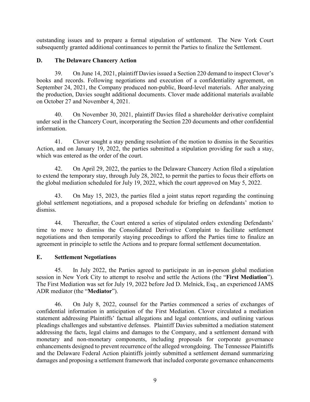 9 outstanding issues and to prepare a formal stipulation of settlement. The New York Court subsequently granted additional continuances to permit the Parties to finalize the Settlement. D. The Delaware Chancery Action 39. On June 14, 2021, plaintiff Davies issued a Section 220 demand to inspect Clover’s books and records. Following negotiations and execution of a confidentiality agreement, on September 24, 2021, the Company produced non-public, Board-level materials. After analyzing the production, Davies sought additional documents. Clover made additional materials available on October 27 and November 4, 2021. 40. On November 30, 2021, plaintiff Davies filed a shareholder derivative complaint under seal in the Chancery Court, incorporating the Section 220 documents and other confidential information. 41. Clover sought a stay pending resolution of the motion to dismiss in the Securities Action, and on January 19, 2022, the parties submitted a stipulation providing for such a stay, which was entered as the order of the court. 42. On April 29, 2022, the parties to the Delaware Chancery Action filed a stipulation to extend the temporary stay, through July 28, 2022, to permit the parties to focus their efforts on the global mediation scheduled for July 19, 2022, which the court approved on May 5, 2022. 43. On May 15, 2023, the parties filed a joint status report regarding the continuing global settlement negotiations, and a proposed schedule for briefing on defendants’ motion to dismiss. 44. Thereafter, the Court entered a series of stipulated orders extending Defendants’ time to move to dismiss the Consolidated Derivative Complaint to facilitate settlement negotiations and then temporarily staying proceedings to afford the Parties time to finalize an agreement in principle to settle the Actions and to prepare formal settlement documentation. E. Settlement Negotiations 45. In July 2022, the Parties agreed to participate in an in-person global mediation session in New York City to attempt to resolve and settle the Actions (the “First Mediation”). The First Mediation was set for July 19, 2022 before Jed D. Melnick, Esq., an experienced JAMS ADR mediator (the “Mediator”). 46. On July 8, 2022, counsel for the Parties commenced a series of exchanges of confidential information in anticipation of the First Mediation. Clover circulated a mediation statement addressing Plaintiffs’ factual allegations and legal contentions, and outlining various pleadings challenges and substantive defenses. Plaintiff Davies submitted a mediation statement addressing the facts, legal claims and damages to the Company, and a settlement demand with monetary and non-monetary components, including proposals for corporate governance enhancements designed to prevent recurrence of the alleged wrongdoing. The Tennessee Plaintiffs and the Delaware Federal Action plaintiffs jointly submitted a settlement demand summarizing damages and proposing a settlement framework that included corporate governance enhancements