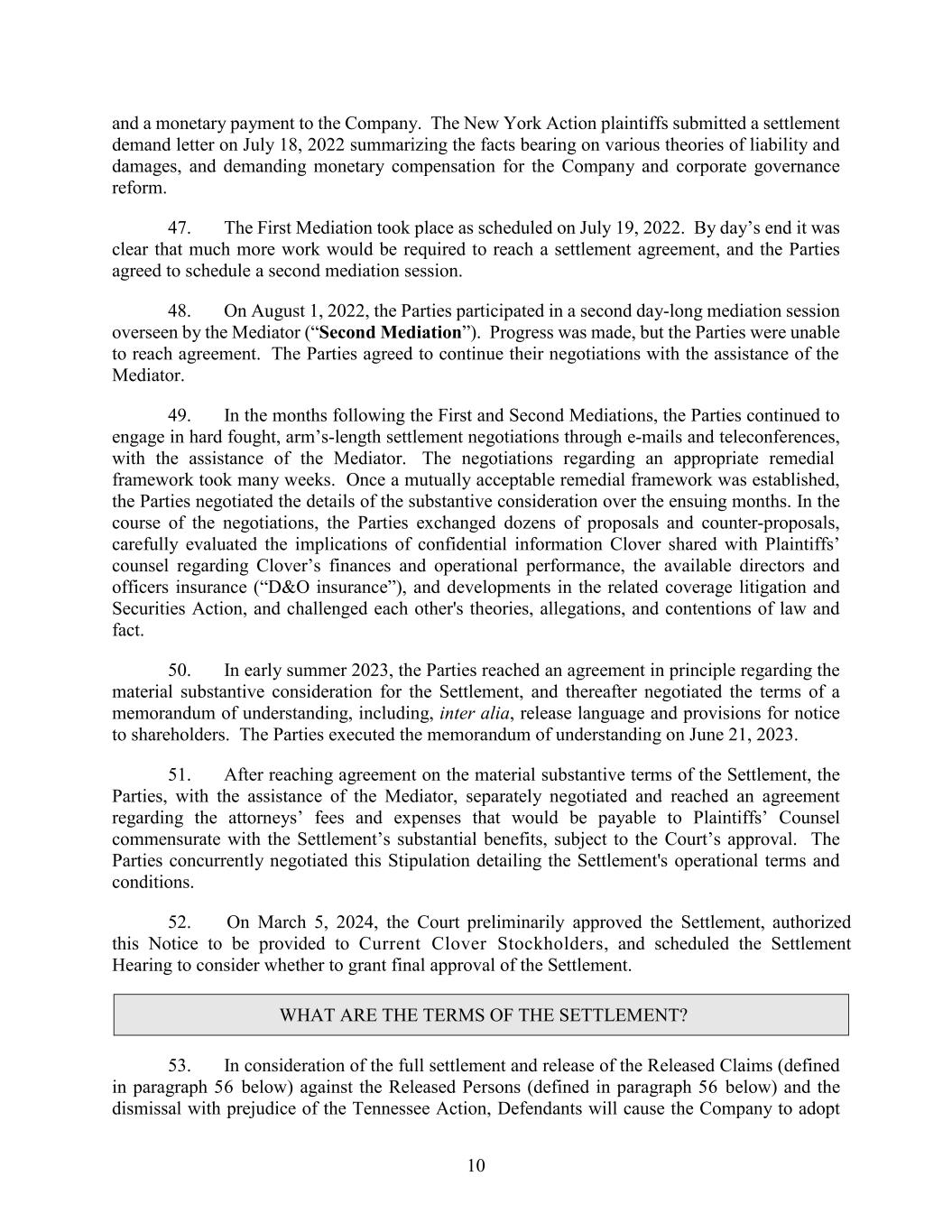 10 and a monetary payment to the Company. The New York Action plaintiffs submitted a settlement demand letter on July 18, 2022 summarizing the facts bearing on various theories of liability and damages, and demanding monetary compensation for the Company and corporate governance reform. 47. The First Mediation took place as scheduled on July 19, 2022. By day’s end it was clear that much more work would be required to reach a settlement agreement, and the Parties agreed to schedule a second mediation session. 48. On August 1, 2022, the Parties participated in a second day-long mediation session overseen by the Mediator (“Second Mediation”). Progress was made, but the Parties were unable to reach agreement. The Parties agreed to continue their negotiations with the assistance of the Mediator. 49. In the months following the First and Second Mediations, the Parties continued to engage in hard fought, arm’s-length settlement negotiations through e-mails and teleconferences, with the assistance of the Mediator. The negotiations regarding an appropriate remedial framework took many weeks. Once a mutually acceptable remedial framework was established, the Parties negotiated the details of the substantive consideration over the ensuing months. In the course of the negotiations, the Parties exchanged dozens of proposals and counter-proposals, carefully evaluated the implications of confidential information Clover shared with Plaintiffs’ counsel regarding Clover’s finances and operational performance, the available directors and officers insurance (“D&O insurance”), and developments in the related coverage litigation and Securities Action, and challenged each other's theories, allegations, and contentions of law and fact. 50. In early summer 2023, the Parties reached an agreement in principle regarding the material substantive consideration for the Settlement, and thereafter negotiated the terms of a memorandum of understanding, including, inter alia, release language and provisions for notice to shareholders. The Parties executed the memorandum of understanding on June 21, 2023. 51. After reaching agreement on the material substantive terms of the Settlement, the Parties, with the assistance of the Mediator, separately negotiated and reached an agreement regarding the attorneys’ fees and expenses that would be payable to Plaintiffs’ Counsel commensurate with the Settlement’s substantial benefits, subject to the Court’s approval. The Parties concurrently negotiated this Stipulation detailing the Settlement's operational terms and conditions. 52. On March 5, 2024, the Court preliminarily approved the Settlement, authorized this Notice to be provided to Current Clover Stockholders, and scheduled the Settlement Hearing to consider whether to grant final approval of the Settlement. WHAT ARE THE TERMS OF THE SETTLEMENT? 53. In consideration of the full settlement and release of the Released Claims (defined in paragraph 56 below) against the Released Persons (defined in paragraph 56 below) and the dismissal with prejudice of the Tennessee Action, Defendants will cause the Company to adopt