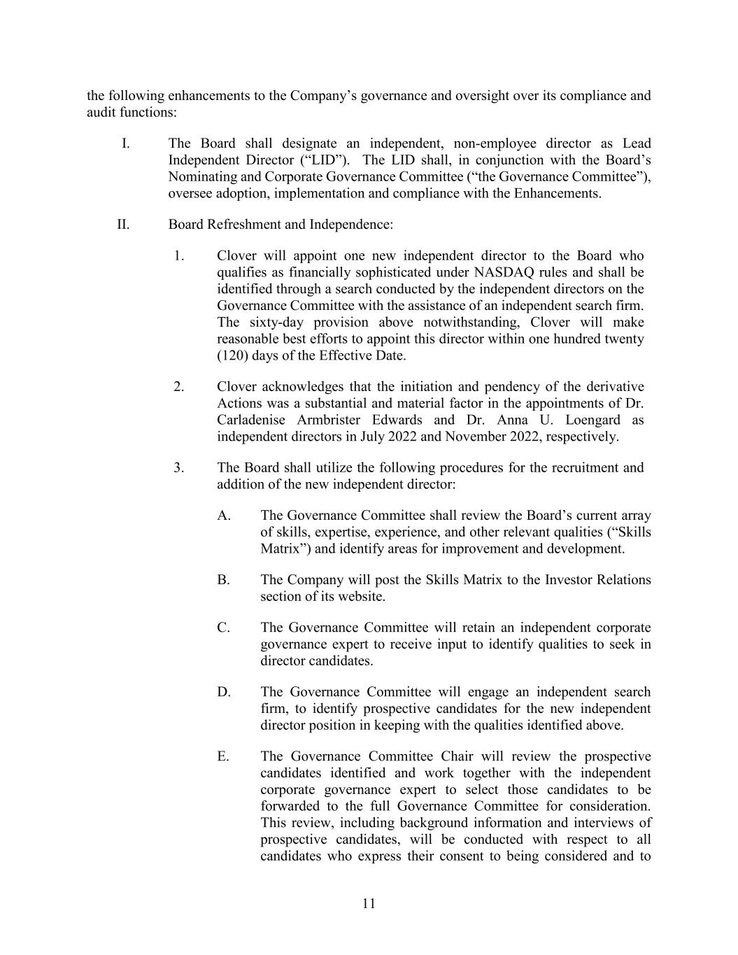 11 the following enhancements to the Company’s governance and oversight over its compliance and audit functions: I. The Board shall designate an independent, non-employee director as Lead Independent Director (“LID”). The LID shall, in conjunction with the Board’s Nominating and Corporate Governance Committee (“the Governance Committee”), oversee adoption, implementation and compliance with the Enhancements. II. Board Refreshment and Independence: 1. Clover will appoint one new independent director to the Board who qualifies as financially sophisticated under NASDAQ rules and shall be identified through a search conducted by the independent directors on the Governance Committee with the assistance of an independent search firm. The sixty-day provision above notwithstanding, Clover will make reasonable best efforts to appoint this director within one hundred twenty (120) days of the Effective Date. 2. Clover acknowledges that the initiation and pendency of the derivative Actions was a substantial and material factor in the appointments of Dr. Carladenise Armbrister Edwards and Dr. Anna U. Loengard as independent directors in July 2022 and November 2022, respectively. 3. The Board shall utilize the following procedures for the recruitment and addition of the new independent director: A. The Governance Committee shall review the Board’s current array of skills, expertise, experience, and other relevant qualities (“Skills Matrix”) and identify areas for improvement and development. B. The Company will post the Skills Matrix to the Investor Relations section of its website. C. The Governance Committee will retain an independent corporate governance expert to receive input to identify qualities to seek in director candidates. D. The Governance Committee will engage an independent search firm, to identify prospective candidates for the new independent director position in keeping with the qualities identified above. E. The Governance Committee Chair will review the prospective candidates identified and work together with the independent corporate governance expert to select those candidates to be forwarded to the full Governance Committee for consideration. This review, including background information and interviews of prospective candidates, will be conducted with respect to all candidates who express their consent to being considered and to