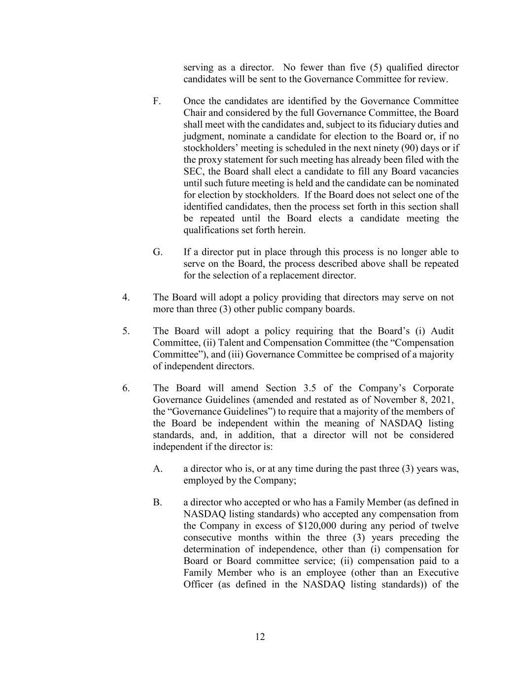 12 serving as a director. No fewer than five (5) qualified director candidates will be sent to the Governance Committee for review. F. Once the candidates are identified by the Governance Committee Chair and considered by the full Governance Committee, the Board shall meet with the candidates and, subject to its fiduciary duties and judgment, nominate a candidate for election to the Board or, if no stockholders’ meeting is scheduled in the next ninety (90) days or if the proxy statement for such meeting has already been filed with the SEC, the Board shall elect a candidate to fill any Board vacancies until such future meeting is held and the candidate can be nominated for election by stockholders. If the Board does not select one of the identified candidates, then the process set forth in this section shall be repeated until the Board elects a candidate meeting the qualifications set forth herein. G. If a director put in place through this process is no longer able to serve on the Board, the process described above shall be repeated for the selection of a replacement director. 4. The Board will adopt a policy providing that directors may serve on not more than three (3) other public company boards. 5. The Board will adopt a policy requiring that the Board’s (i) Audit Committee, (ii) Talent and Compensation Committee (the “Compensation Committee”), and (iii) Governance Committee be comprised of a majority of independent directors. 6. The Board will amend Section 3.5 of the Company’s Corporate Governance Guidelines (amended and restated as of November 8, 2021, the “Governance Guidelines”) to require that a majority of the members of the Board be independent within the meaning of NASDAQ listing standards, and, in addition, that a director will not be considered independent if the director is: A. a director who is, or at any time during the past three (3) years was, employed by the Company; B. a director who accepted or who has a Family Member (as defined in NASDAQ listing standards) who accepted any compensation from the Company in excess of $120,000 during any period of twelve consecutive months within the three (3) years preceding the determination of independence, other than (i) compensation for Board or Board committee service; (ii) compensation paid to a Family Member who is an employee (other than an Executive Officer (as defined in the NASDAQ listing standards)) of the