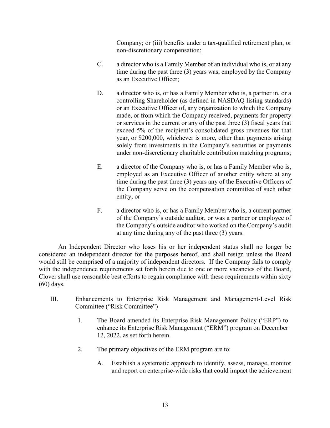 13 Company; or (iii) benefits under a tax-qualified retirement plan, or non-discretionary compensation; C. a director who is a Family Member of an individual who is, or at any time during the past three (3) years was, employed by the Company as an Executive Officer; D. a director who is, or has a Family Member who is, a partner in, or a controlling Shareholder (as defined in NASDAQ listing standards) or an Executive Officer of, any organization to which the Company made, or from which the Company received, payments for property or services in the current or any of the past three (3) fiscal years that exceed 5% of the recipient’s consolidated gross revenues for that year, or $200,000, whichever is more, other than payments arising solely from investments in the Company’s securities or payments under non-discretionary charitable contribution matching programs; E. a director of the Company who is, or has a Family Member who is, employed as an Executive Officer of another entity where at any time during the past three (3) years any of the Executive Officers of the Company serve on the compensation committee of such other entity; or F. a director who is, or has a Family Member who is, a current partner of the Company’s outside auditor, or was a partner or employee of the Company’s outside auditor who worked on the Company’s audit at any time during any of the past three (3) years. An Independent Director who loses his or her independent status shall no longer be considered an independent director for the purposes hereof, and shall resign unless the Board would still be comprised of a majority of independent directors. If the Company fails to comply with the independence requirements set forth herein due to one or more vacancies of the Board, Clover shall use reasonable best efforts to regain compliance with these requirements within sixty (60) days. III. Enhancements to Enterprise Risk Management and Management-Level Risk Committee (“Risk Committee”) 1. The Board amended its Enterprise Risk Management Policy (“ERP”) to enhance its Enterprise Risk Management (“ERM”) program on December 12, 2022, as set forth herein. 2. The primary objectives of the ERM program are to: A. Establish a systematic approach to identify, assess, manage, monitor and report on enterprise-wide risks that could impact the achievement