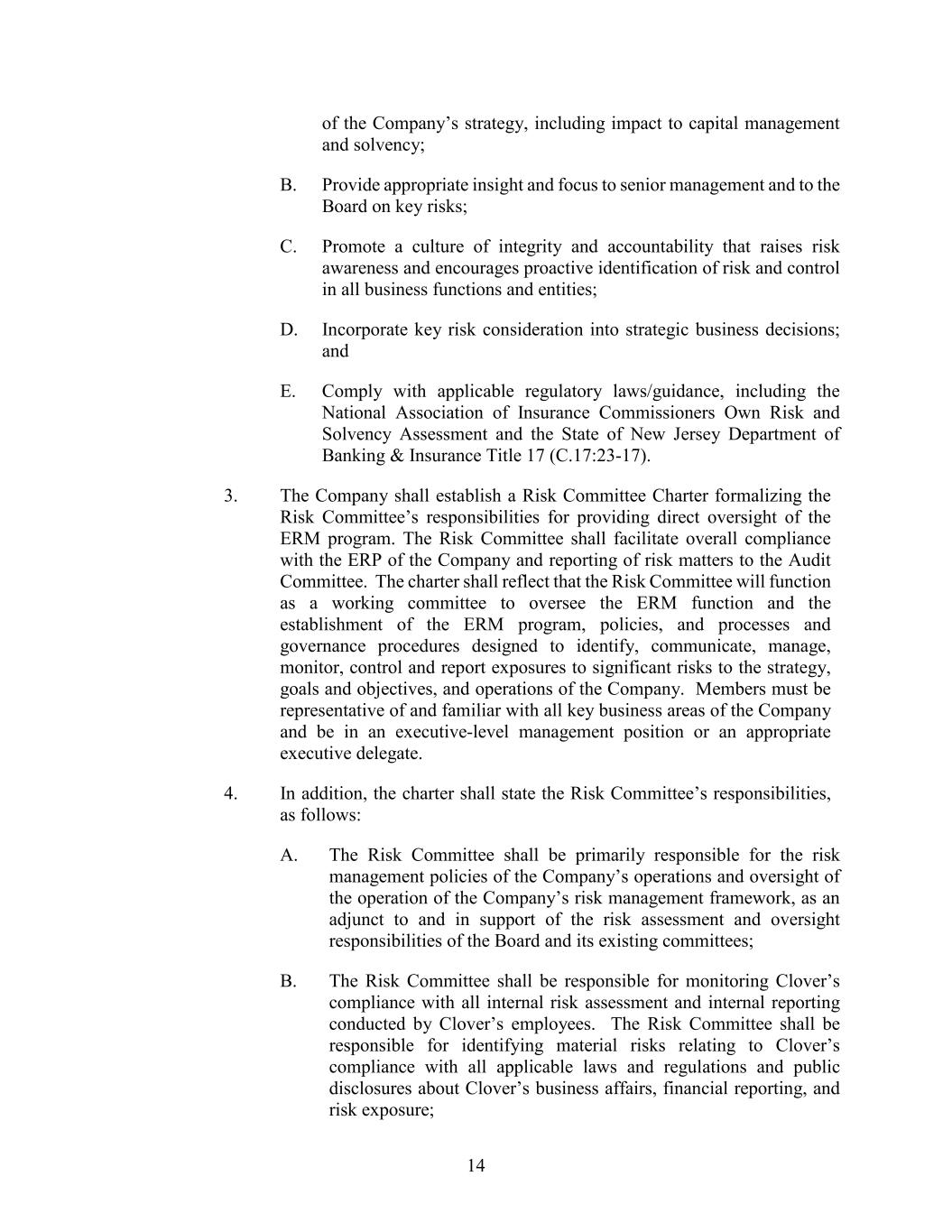 14 of the Company’s strategy, including impact to capital management and solvency; B. Provide appropriate insight and focus to senior management and to the Board on key risks; C. Promote a culture of integrity and accountability that raises risk awareness and encourages proactive identification of risk and control in all business functions and entities; D. Incorporate key risk consideration into strategic business decisions; and E. Comply with applicable regulatory laws/guidance, including the National Association of Insurance Commissioners Own Risk and Solvency Assessment and the State of New Jersey Department of Banking & Insurance Title 17 (C.17:23-17). 3. The Company shall establish a Risk Committee Charter formalizing the Risk Committee’s responsibilities for providing direct oversight of the ERM program. The Risk Committee shall facilitate overall compliance with the ERP of the Company and reporting of risk matters to the Audit Committee. The charter shall reflect that the Risk Committee will function as a working committee to oversee the ERM function and the establishment of the ERM program, policies, and processes and governance procedures designed to identify, communicate, manage, monitor, control and report exposures to significant risks to the strategy, goals and objectives, and operations of the Company. Members must be representative of and familiar with all key business areas of the Company and be in an executive-level management position or an appropriate executive delegate. 4. In addition, the charter shall state the Risk Committee’s responsibilities, as follows: A. The Risk Committee shall be primarily responsible for the risk management policies of the Company’s operations and oversight of the operation of the Company’s risk management framework, as an adjunct to and in support of the risk assessment and oversight responsibilities of the Board and its existing committees; B. The Risk Committee shall be responsible for monitoring Clover’s compliance with all internal risk assessment and internal reporting conducted by Clover’s employees. The Risk Committee shall be responsible for identifying material risks relating to Clover’s compliance with all applicable laws and regulations and public disclosures about Clover’s business affairs, financial reporting, and risk exposure;