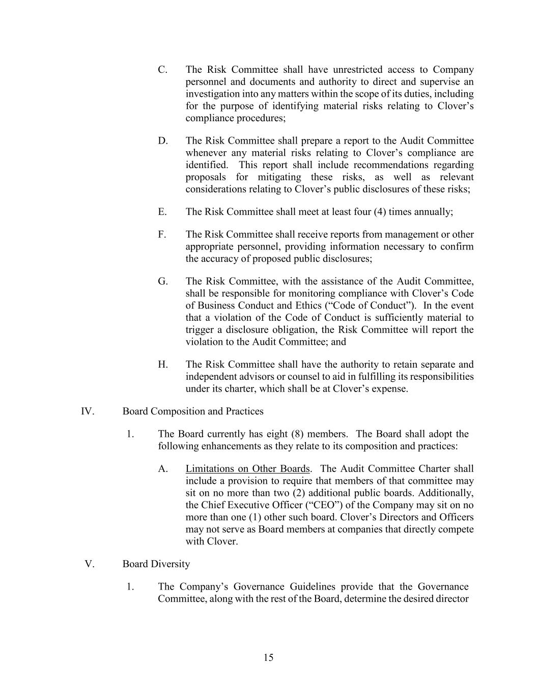 15 C. The Risk Committee shall have unrestricted access to Company personnel and documents and authority to direct and supervise an investigation into any matters within the scope of its duties, including for the purpose of identifying material risks relating to Clover’s compliance procedures; D. The Risk Committee shall prepare a report to the Audit Committee whenever any material risks relating to Clover’s compliance are identified. This report shall include recommendations regarding proposals for mitigating these risks, as well as relevant considerations relating to Clover’s public disclosures of these risks; E. The Risk Committee shall meet at least four (4) times annually; F. The Risk Committee shall receive reports from management or other appropriate personnel, providing information necessary to confirm the accuracy of proposed public disclosures; G. The Risk Committee, with the assistance of the Audit Committee, shall be responsible for monitoring compliance with Clover’s Code of Business Conduct and Ethics (“Code of Conduct”). In the event that a violation of the Code of Conduct is sufficiently material to trigger a disclosure obligation, the Risk Committee will report the violation to the Audit Committee; and H. The Risk Committee shall have the authority to retain separate and independent advisors or counsel to aid in fulfilling its responsibilities under its charter, which shall be at Clover’s expense. IV. Board Composition and Practices 1. The Board currently has eight (8) members. The Board shall adopt the following enhancements as they relate to its composition and practices: A. Limitations on Other Boards. The Audit Committee Charter shall include a provision to require that members of that committee may sit on no more than two (2) additional public boards. Additionally, the Chief Executive Officer (“CEO”) of the Company may sit on no more than one (1) other such board. Clover’s Directors and Officers may not serve as Board members at companies that directly compete with Clover. V. Board Diversity 1. The Company’s Governance Guidelines provide that the Governance Committee, along with the rest of the Board, determine the desired director