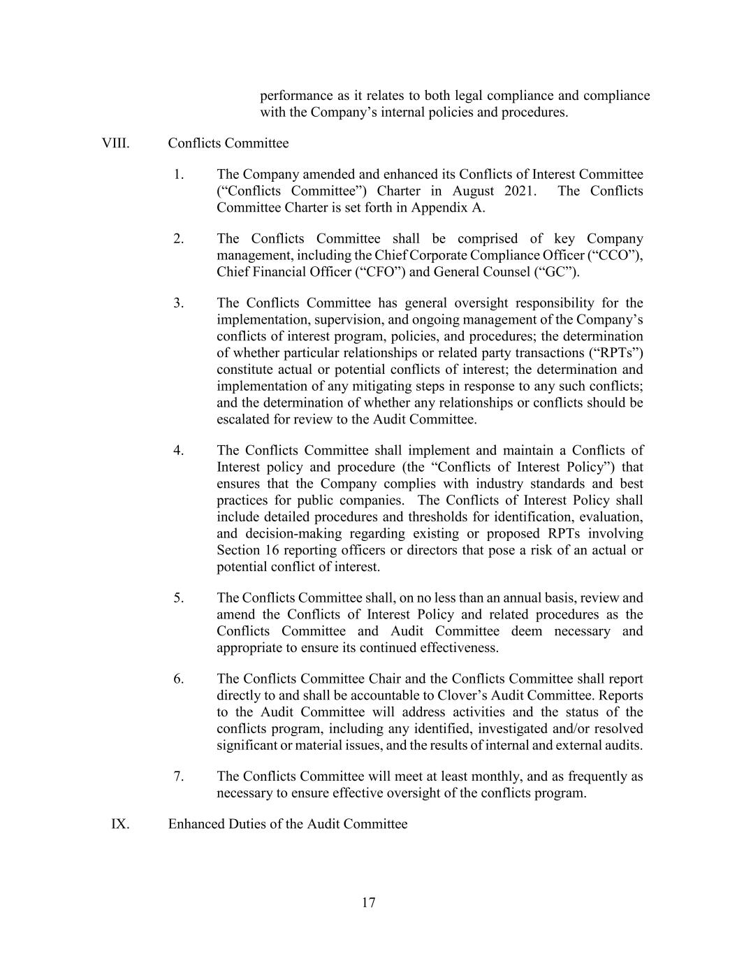 17 performance as it relates to both legal compliance and compliance with the Company’s internal policies and procedures. VIII. Conflicts Committee 1. The Company amended and enhanced its Conflicts of Interest Committee (“Conflicts Committee”) Charter in August 2021. The Conflicts Committee Charter is set forth in Appendix A. 2. The Conflicts Committee shall be comprised of key Company management, including the Chief Corporate Compliance Officer (“CCO”), Chief Financial Officer (“CFO”) and General Counsel (“GC”). 3. The Conflicts Committee has general oversight responsibility for the implementation, supervision, and ongoing management of the Company’s conflicts of interest program, policies, and procedures; the determination of whether particular relationships or related party transactions (“RPTs”) constitute actual or potential conflicts of interest; the determination and implementation of any mitigating steps in response to any such conflicts; and the determination of whether any relationships or conflicts should be escalated for review to the Audit Committee. 4. The Conflicts Committee shall implement and maintain a Conflicts of Interest policy and procedure (the “Conflicts of Interest Policy”) that ensures that the Company complies with industry standards and best practices for public companies. The Conflicts of Interest Policy shall include detailed procedures and thresholds for identification, evaluation, and decision-making regarding existing or proposed RPTs involving Section 16 reporting officers or directors that pose a risk of an actual or potential conflict of interest. 5. The Conflicts Committee shall, on no less than an annual basis, review and amend the Conflicts of Interest Policy and related procedures as the Conflicts Committee and Audit Committee deem necessary and appropriate to ensure its continued effectiveness. 6. The Conflicts Committee Chair and the Conflicts Committee shall report directly to and shall be accountable to Clover’s Audit Committee. Reports to the Audit Committee will address activities and the status of the conflicts program, including any identified, investigated and/or resolved significant or material issues, and the results of internal and external audits. 7. The Conflicts Committee will meet at least monthly, and as frequently as necessary to ensure effective oversight of the conflicts program. IX. Enhanced Duties of the Audit Committee
