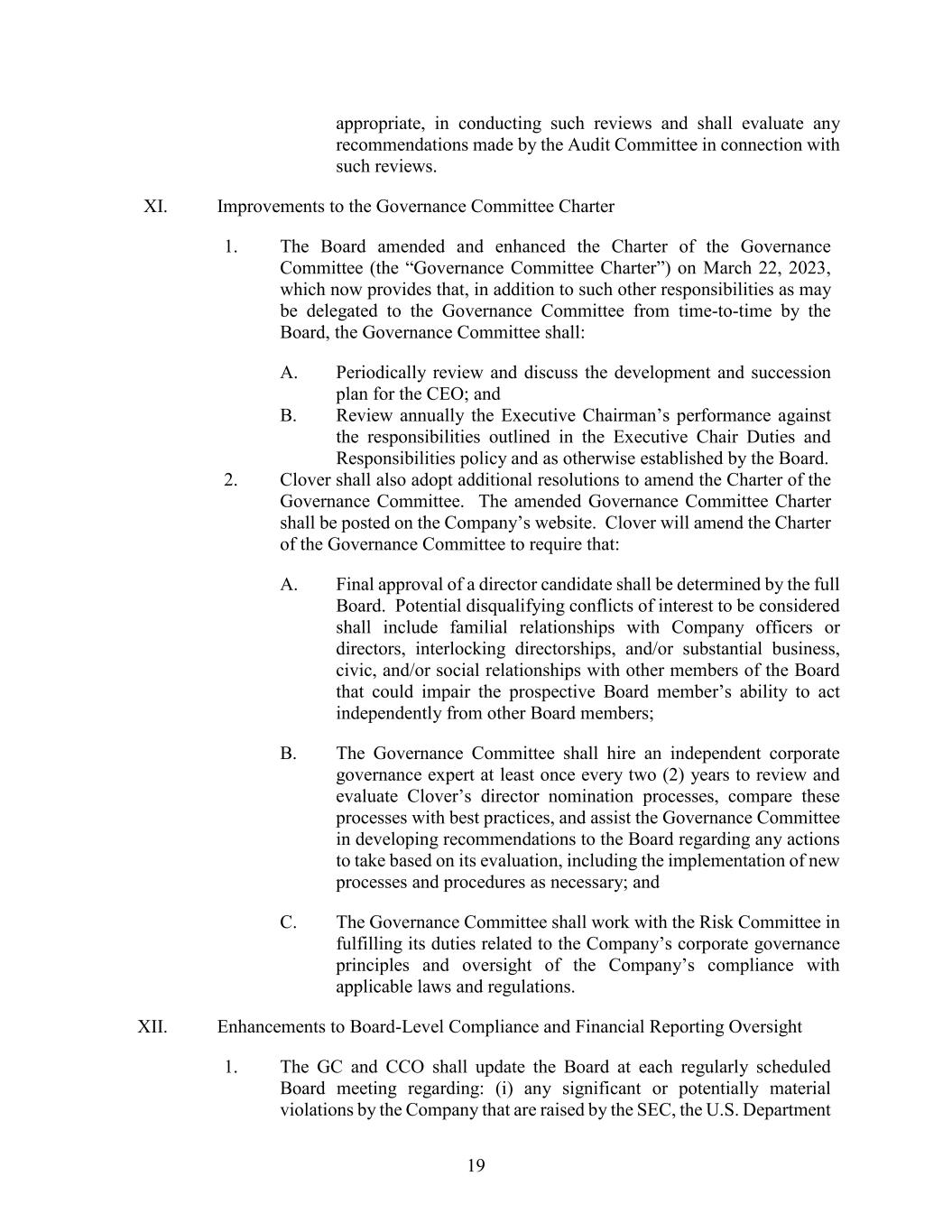 19 appropriate, in conducting such reviews and shall evaluate any recommendations made by the Audit Committee in connection with such reviews. XI. Improvements to the Governance Committee Charter 1. The Board amended and enhanced the Charter of the Governance Committee (the “Governance Committee Charter”) on March 22, 2023, which now provides that, in addition to such other responsibilities as may be delegated to the Governance Committee from time-to-time by the Board, the Governance Committee shall: A. Periodically review and discuss the development and succession plan for the CEO; and B. Review annually the Executive Chairman’s performance against the responsibilities outlined in the Executive Chair Duties and Responsibilities policy and as otherwise established by the Board. 2. Clover shall also adopt additional resolutions to amend the Charter of the Governance Committee. The amended Governance Committee Charter shall be posted on the Company’s website. Clover will amend the Charter of the Governance Committee to require that: A. Final approval of a director candidate shall be determined by the full Board. Potential disqualifying conflicts of interest to be considered shall include familial relationships with Company officers or directors, interlocking directorships, and/or substantial business, civic, and/or social relationships with other members of the Board that could impair the prospective Board member’s ability to act independently from other Board members; B. The Governance Committee shall hire an independent corporate governance expert at least once every two (2) years to review and evaluate Clover’s director nomination processes, compare these processes with best practices, and assist the Governance Committee in developing recommendations to the Board regarding any actions to take based on its evaluation, including the implementation of new processes and procedures as necessary; and C. The Governance Committee shall work with the Risk Committee in fulfilling its duties related to the Company’s corporate governance principles and oversight of the Company’s compliance with applicable laws and regulations. XII. Enhancements to Board-Level Compliance and Financial Reporting Oversight 1. The GC and CCO shall update the Board at each regularly scheduled Board meeting regarding: (i) any significant or potentially material violations by the Company that are raised by the SEC, the U.S. Department