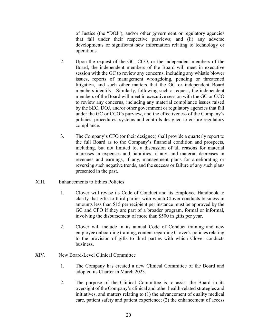 20 of Justice (the “DOJ”), and/or other government or regulatory agencies that fall under their respective purviews; and (ii) any adverse developments or significant new information relating to technology or operations. 2. Upon the request of the GC, CCO, or the independent members of the Board, the independent members of the Board will meet in executive session with the GC to review any concerns, including any whistle blower issues, reports of management wrongdoing, pending or threatened litigation, and such other matters that the GC or independent Board members identify. Similarly, following such a request, the independent members of the Board will meet in executive session with the GC or CCO to review any concerns, including any material compliance issues raised by the SEC, DOJ, and/or other government or regulatory agencies that fall under the GC or CCO’s purview, and the effectiveness of the Company’s policies, procedures, systems and controls designed to ensure regulatory compliance. 3. The Company’s CFO (or their designee) shall provide a quarterly report to the full Board as to the Company’s financial condition and prospects, including, but not limited to, a discussion of all reasons for material increases in expenses and liabilities, if any, and material decreases in revenues and earnings, if any, management plans for ameliorating or reversing such negative trends, and the success or failure of any such plans presented in the past. XIII. Enhancements to Ethics Policies 1. Clover will revise its Code of Conduct and its Employee Handbook to clarify that gifts to third parties with which Clover conducts business in amounts less than $15 per recipient per instance must be approved by the GC and CFO if they are part of a broader program, formal or informal, involving the disbursement of more than $500 in gifts per year. 2. Clover will include in its annual Code of Conduct training and new employee onboarding training, content regarding Clover’s policies relating to the provision of gifts to third parties with which Clover conducts business. XIV. New Board-Level Clinical Committee 1. The Company has created a new Clinical Committee of the Board and adopted its Charter in March 2023. 2. The purpose of the Clinical Committee is to assist the Board in its oversight of the Company’s clinical and other health-related strategies and initiatives, and matters relating to (1) the advancement of quality medical care, patient safety and patient experience; (2) the enhancement of access