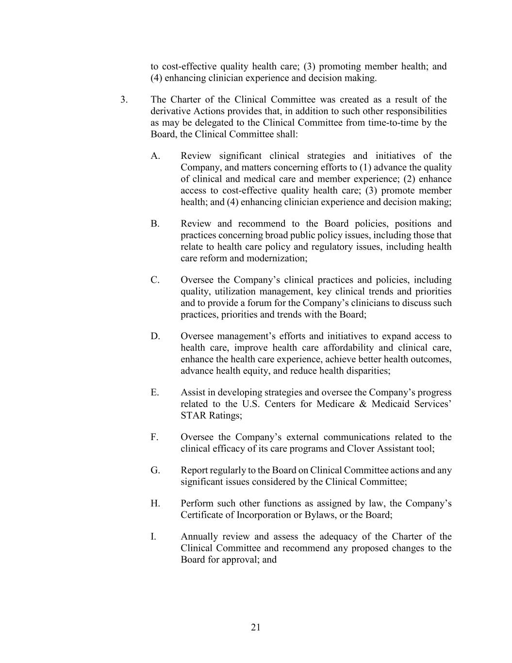 21 to cost-effective quality health care; (3) promoting member health; and (4) enhancing clinician experience and decision making. 3. The Charter of the Clinical Committee was created as a result of the derivative Actions provides that, in addition to such other responsibilities as may be delegated to the Clinical Committee from time-to-time by the Board, the Clinical Committee shall: A. Review significant clinical strategies and initiatives of the Company, and matters concerning efforts to (1) advance the quality of clinical and medical care and member experience; (2) enhance access to cost-effective quality health care; (3) promote member health; and (4) enhancing clinician experience and decision making; B. Review and recommend to the Board policies, positions and practices concerning broad public policy issues, including those that relate to health care policy and regulatory issues, including health care reform and modernization; C. Oversee the Company’s clinical practices and policies, including quality, utilization management, key clinical trends and priorities and to provide a forum for the Company’s clinicians to discuss such practices, priorities and trends with the Board; D. Oversee management’s efforts and initiatives to expand access to health care, improve health care affordability and clinical care, enhance the health care experience, achieve better health outcomes, advance health equity, and reduce health disparities; E. Assist in developing strategies and oversee the Company’s progress related to the U.S. Centers for Medicare & Medicaid Services’ STAR Ratings; F. Oversee the Company’s external communications related to the clinical efficacy of its care programs and Clover Assistant tool; G. Report regularly to the Board on Clinical Committee actions and any significant issues considered by the Clinical Committee; H. Perform such other functions as assigned by law, the Company’s Certificate of Incorporation or Bylaws, or the Board; I. Annually review and assess the adequacy of the Charter of the Clinical Committee and recommend any proposed changes to the Board for approval; and