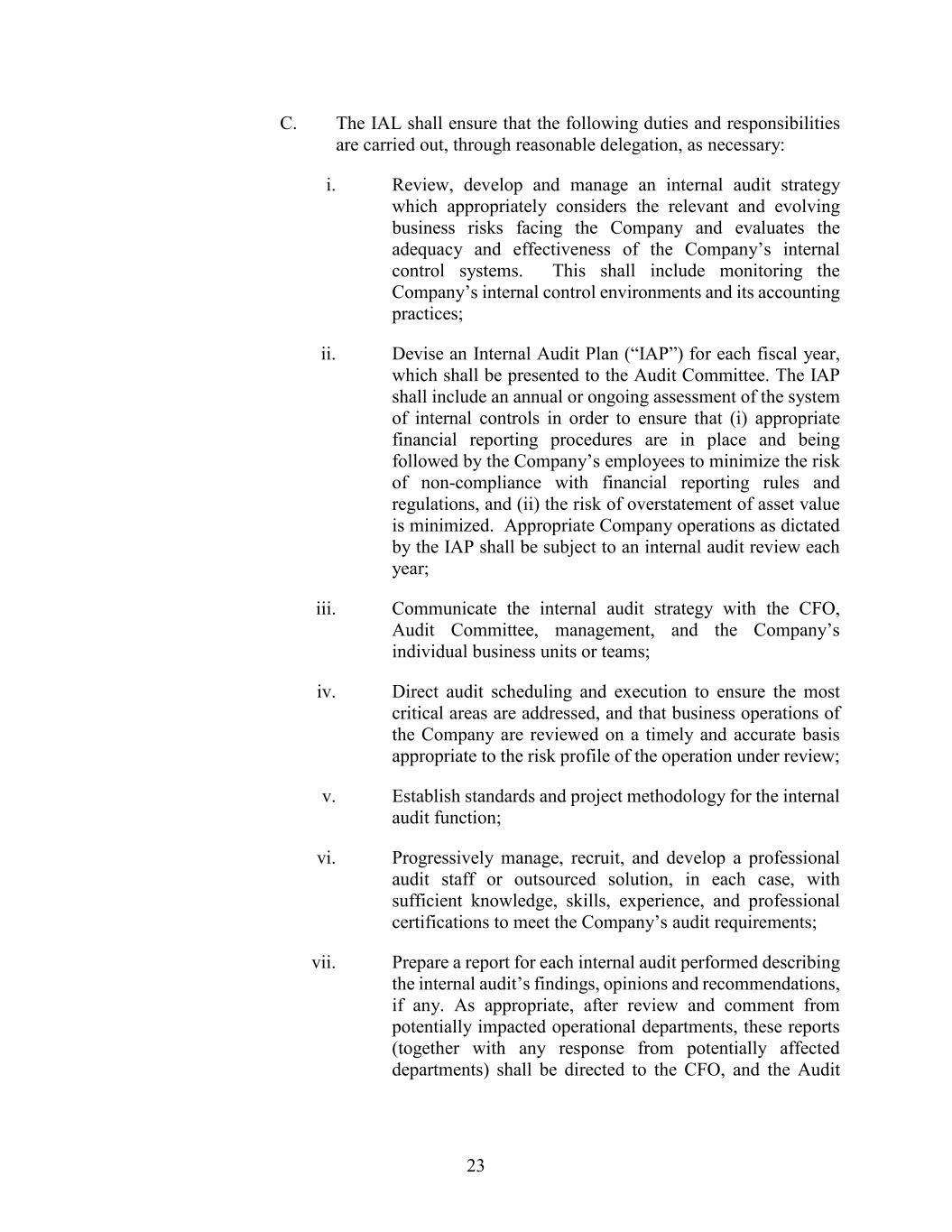 23 C. The IAL shall ensure that the following duties and responsibilities are carried out, through reasonable delegation, as necessary: i. Review, develop and manage an internal audit strategy which appropriately considers the relevant and evolving business risks facing the Company and evaluates the adequacy and effectiveness of the Company’s internal control systems. This shall include monitoring the Company’s internal control environments and its accounting practices; ii. Devise an Internal Audit Plan (“IAP”) for each fiscal year, which shall be presented to the Audit Committee. The IAP shall include an annual or ongoing assessment of the system of internal controls in order to ensure that (i) appropriate financial reporting procedures are in place and being followed by the Company’s employees to minimize the risk of non-compliance with financial reporting rules and regulations, and (ii) the risk of overstatement of asset value is minimized. Appropriate Company operations as dictated by the IAP shall be subject to an internal audit review each year; iii. Communicate the internal audit strategy with the CFO, Audit Committee, management, and the Company’s individual business units or teams; iv. Direct audit scheduling and execution to ensure the most critical areas are addressed, and that business operations of the Company are reviewed on a timely and accurate basis appropriate to the risk profile of the operation under review; v. Establish standards and project methodology for the internal audit function; vi. Progressively manage, recruit, and develop a professional audit staff or outsourced solution, in each case, with sufficient knowledge, skills, experience, and professional certifications to meet the Company’s audit requirements; vii. Prepare a report for each internal audit performed describing the internal audit’s findings, opinions and recommendations, if any. As appropriate, after review and comment from potentially impacted operational departments, these reports (together with any response from potentially affected departments) shall be directed to the CFO, and the Audit