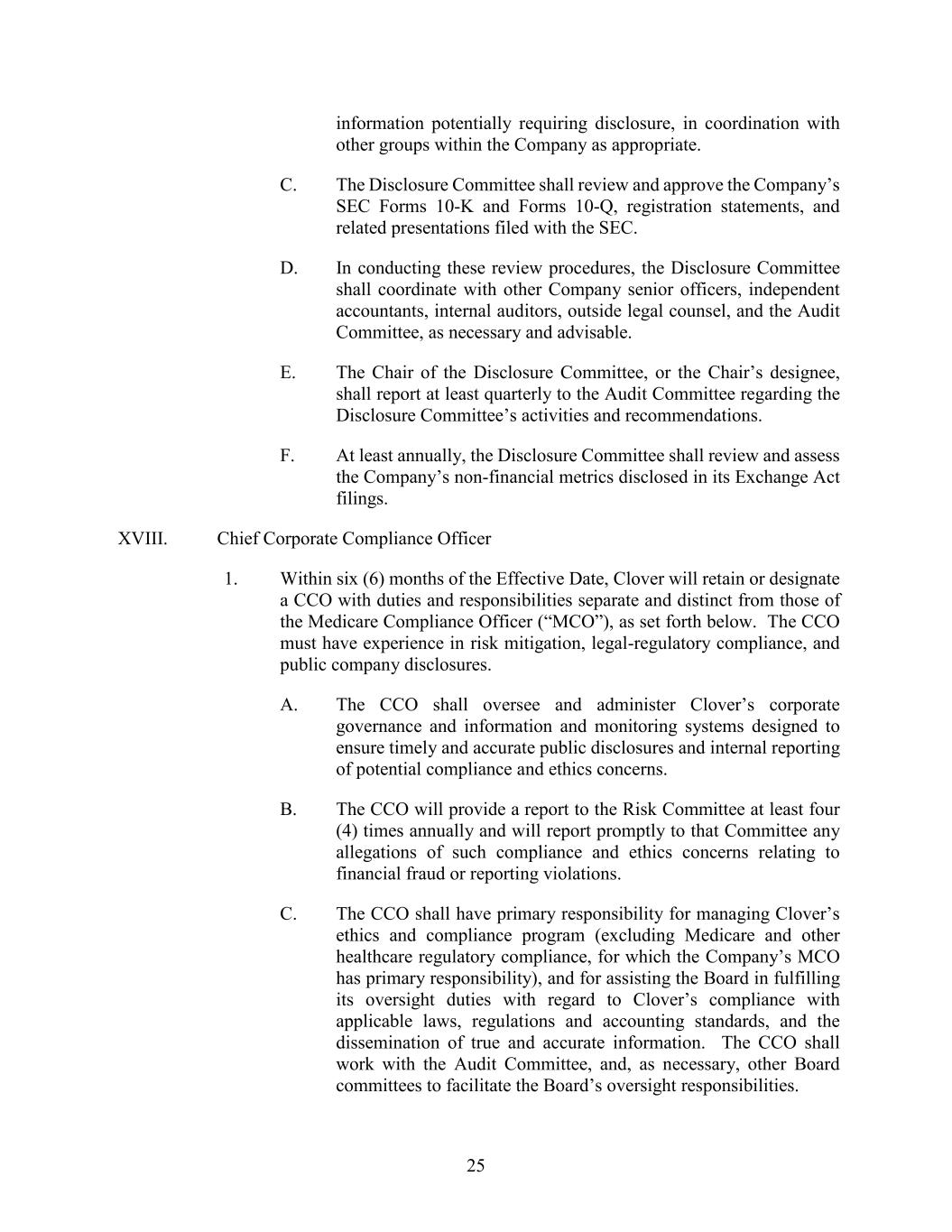 25 information potentially requiring disclosure, in coordination with other groups within the Company as appropriate. C. The Disclosure Committee shall review and approve the Company’s SEC Forms 10-K and Forms 10-Q, registration statements, and related presentations filed with the SEC. D. In conducting these review procedures, the Disclosure Committee shall coordinate with other Company senior officers, independent accountants, internal auditors, outside legal counsel, and the Audit Committee, as necessary and advisable. E. The Chair of the Disclosure Committee, or the Chair’s designee, shall report at least quarterly to the Audit Committee regarding the Disclosure Committee’s activities and recommendations. F. At least annually, the Disclosure Committee shall review and assess the Company’s non-financial metrics disclosed in its Exchange Act filings. XVIII. Chief Corporate Compliance Officer 1. Within six (6) months of the Effective Date, Clover will retain or designate a CCO with duties and responsibilities separate and distinct from those of the Medicare Compliance Officer (“MCO”), as set forth below. The CCO must have experience in risk mitigation, legal-regulatory compliance, and public company disclosures. A. The CCO shall oversee and administer Clover’s corporate governance and information and monitoring systems designed to ensure timely and accurate public disclosures and internal reporting of potential compliance and ethics concerns. B. The CCO will provide a report to the Risk Committee at least four (4) times annually and will report promptly to that Committee any allegations of such compliance and ethics concerns relating to financial fraud or reporting violations. C. The CCO shall have primary responsibility for managing Clover’s ethics and compliance program (excluding Medicare and other healthcare regulatory compliance, for which the Company’s MCO has primary responsibility), and for assisting the Board in fulfilling its oversight duties with regard to Clover’s compliance with applicable laws, regulations and accounting standards, and the dissemination of true and accurate information. The CCO shall work with the Audit Committee, and, as necessary, other Board committees to facilitate the Board’s oversight responsibilities.