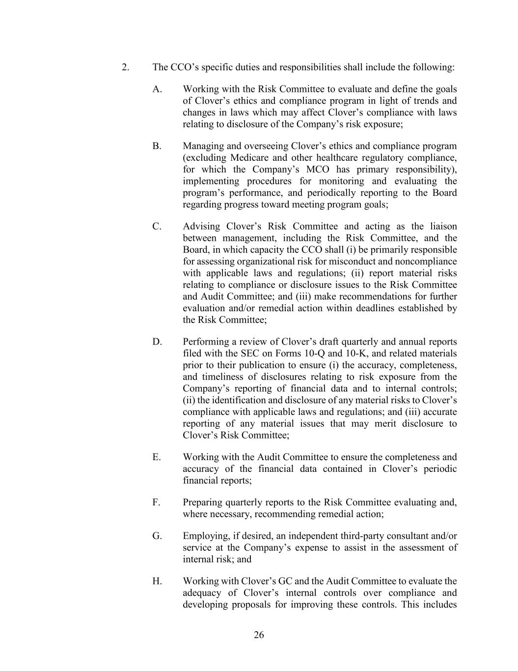 26 2. The CCO’s specific duties and responsibilities shall include the following: A. Working with the Risk Committee to evaluate and define the goals of Clover’s ethics and compliance program in light of trends and changes in laws which may affect Clover’s compliance with laws relating to disclosure of the Company’s risk exposure; B. Managing and overseeing Clover’s ethics and compliance program (excluding Medicare and other healthcare regulatory compliance, for which the Company’s MCO has primary responsibility), implementing procedures for monitoring and evaluating the program’s performance, and periodically reporting to the Board regarding progress toward meeting program goals; C. Advising Clover’s Risk Committee and acting as the liaison between management, including the Risk Committee, and the Board, in which capacity the CCO shall (i) be primarily responsible for assessing organizational risk for misconduct and noncompliance with applicable laws and regulations; (ii) report material risks relating to compliance or disclosure issues to the Risk Committee and Audit Committee; and (iii) make recommendations for further evaluation and/or remedial action within deadlines established by the Risk Committee; D. Performing a review of Clover’s draft quarterly and annual reports filed with the SEC on Forms 10-Q and 10-K, and related materials prior to their publication to ensure (i) the accuracy, completeness, and timeliness of disclosures relating to risk exposure from the Company’s reporting of financial data and to internal controls; (ii) the identification and disclosure of any material risks to Clover’s compliance with applicable laws and regulations; and (iii) accurate reporting of any material issues that may merit disclosure to Clover’s Risk Committee; E. Working with the Audit Committee to ensure the completeness and accuracy of the financial data contained in Clover’s periodic financial reports; F. Preparing quarterly reports to the Risk Committee evaluating and, where necessary, recommending remedial action; G. Employing, if desired, an independent third-party consultant and/or service at the Company’s expense to assist in the assessment of internal risk; and H. Working with Clover’s GC and the Audit Committee to evaluate the adequacy of Clover’s internal controls over compliance and developing proposals for improving these controls. This includes