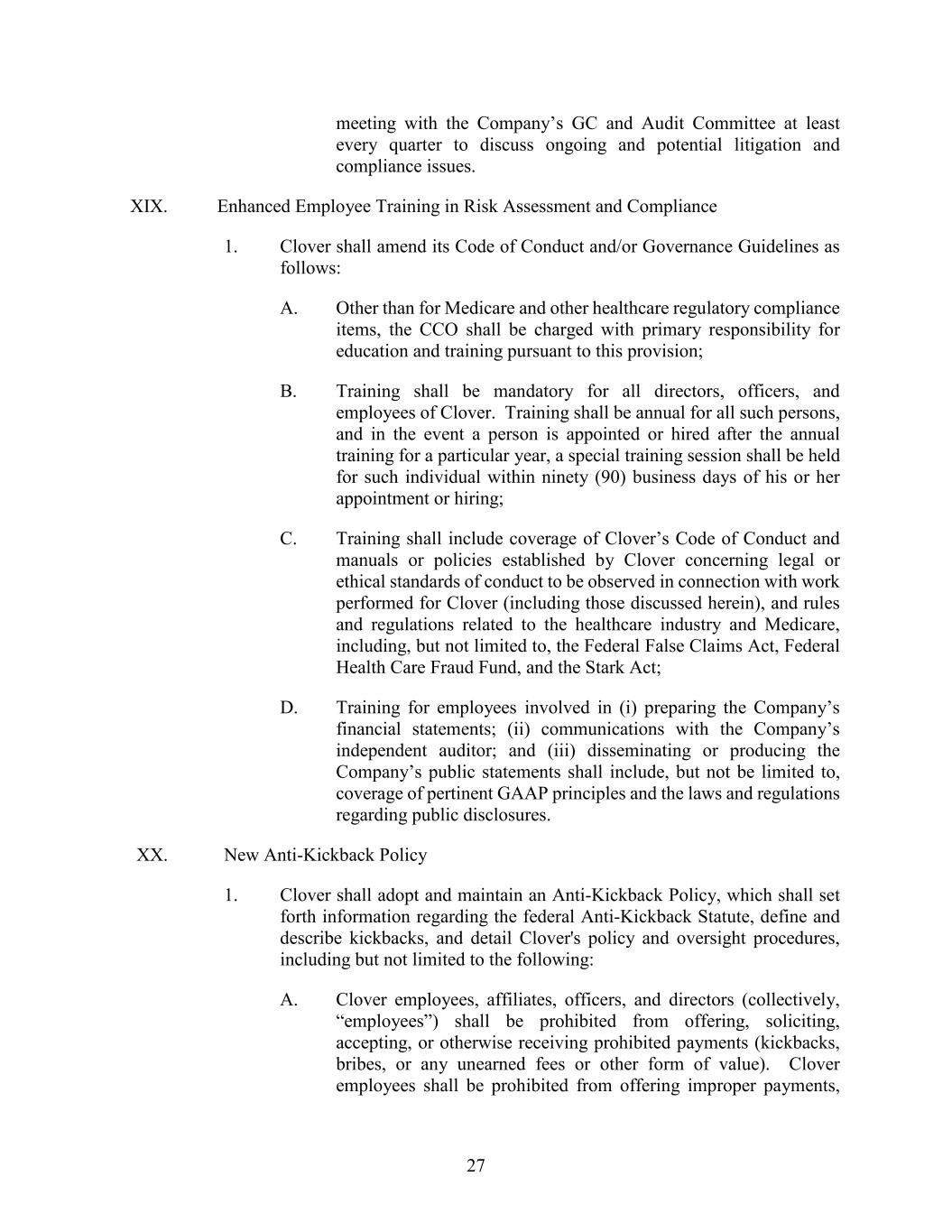 27 meeting with the Company’s GC and Audit Committee at least every quarter to discuss ongoing and potential litigation and compliance issues. XIX. Enhanced Employee Training in Risk Assessment and Compliance 1. Clover shall amend its Code of Conduct and/or Governance Guidelines as follows: A. Other than for Medicare and other healthcare regulatory compliance items, the CCO shall be charged with primary responsibility for education and training pursuant to this provision; B. Training shall be mandatory for all directors, officers, and employees of Clover. Training shall be annual for all such persons, and in the event a person is appointed or hired after the annual training for a particular year, a special training session shall be held for such individual within ninety (90) business days of his or her appointment or hiring; C. Training shall include coverage of Clover’s Code of Conduct and manuals or policies established by Clover concerning legal or ethical standards of conduct to be observed in connection with work performed for Clover (including those discussed herein), and rules and regulations related to the healthcare industry and Medicare, including, but not limited to, the Federal False Claims Act, Federal Health Care Fraud Fund, and the Stark Act; D. Training for employees involved in (i) preparing the Company’s financial statements; (ii) communications with the Company’s independent auditor; and (iii) disseminating or producing the Company’s public statements shall include, but not be limited to, coverage of pertinent GAAP principles and the laws and regulations regarding public disclosures. XX. New Anti-Kickback Policy 1. Clover shall adopt and maintain an Anti-Kickback Policy, which shall set forth information regarding the federal Anti-Kickback Statute, define and describe kickbacks, and detail Clover's policy and oversight procedures, including but not limited to the following: A. Clover employees, affiliates, officers, and directors (collectively, “employees”) shall be prohibited from offering, soliciting, accepting, or otherwise receiving prohibited payments (kickbacks, bribes, or any unearned fees or other form of value). Clover employees shall be prohibited from offering improper payments,