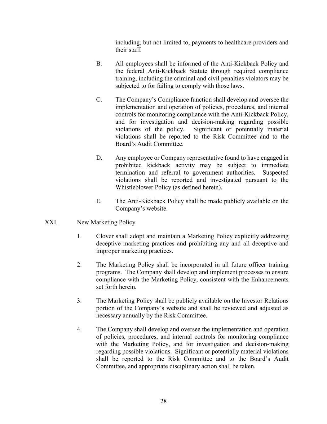 28 including, but not limited to, payments to healthcare providers and their staff. B. All employees shall be informed of the Anti-Kickback Policy and the federal Anti-Kickback Statute through required compliance training, including the criminal and civil penalties violators may be subjected to for failing to comply with those laws. C. The Company’s Compliance function shall develop and oversee the implementation and operation of policies, procedures, and internal controls for monitoring compliance with the Anti-Kickback Policy, and for investigation and decision-making regarding possible violations of the policy. Significant or potentially material violations shall be reported to the Risk Committee and to the Board’s Audit Committee. D. Any employee or Company representative found to have engaged in prohibited kickback activity may be subject to immediate termination and referral to government authorities. Suspected violations shall be reported and investigated pursuant to the Whistleblower Policy (as defined herein). E. The Anti-Kickback Policy shall be made publicly available on the Company’s website. XXI. New Marketing Policy 1. Clover shall adopt and maintain a Marketing Policy explicitly addressing deceptive marketing practices and prohibiting any and all deceptive and improper marketing practices. 2. The Marketing Policy shall be incorporated in all future officer training programs. The Company shall develop and implement processes to ensure compliance with the Marketing Policy, consistent with the Enhancements set forth herein. 3. The Marketing Policy shall be publicly available on the Investor Relations portion of the Company’s website and shall be reviewed and adjusted as necessary annually by the Risk Committee. 4. The Company shall develop and oversee the implementation and operation of policies, procedures, and internal controls for monitoring compliance with the Marketing Policy, and for investigation and decision-making regarding possible violations. Significant or potentially material violations shall be reported to the Risk Committee and to the Board’s Audit Committee, and appropriate disciplinary action shall be taken.