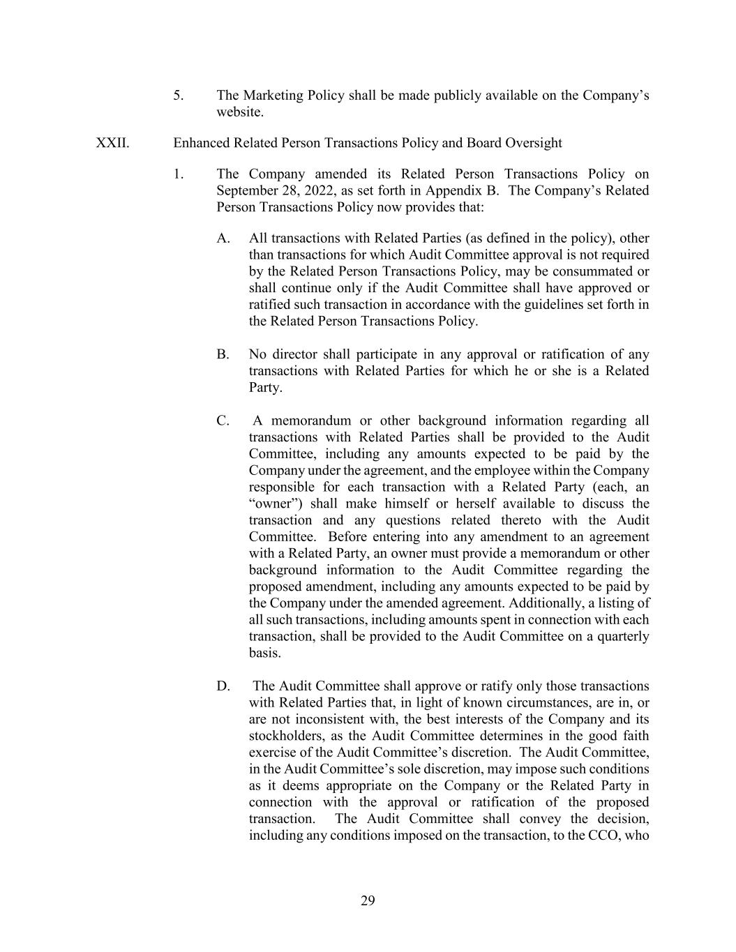 29 5. The Marketing Policy shall be made publicly available on the Company’s website. XXII. Enhanced Related Person Transactions Policy and Board Oversight 1. The Company amended its Related Person Transactions Policy on September 28, 2022, as set forth in Appendix B. The Company’s Related Person Transactions Policy now provides that: A. All transactions with Related Parties (as defined in the policy), other than transactions for which Audit Committee approval is not required by the Related Person Transactions Policy, may be consummated or shall continue only if the Audit Committee shall have approved or ratified such transaction in accordance with the guidelines set forth in the Related Person Transactions Policy. B. No director shall participate in any approval or ratification of any transactions with Related Parties for which he or she is a Related Party. C. A memorandum or other background information regarding all transactions with Related Parties shall be provided to the Audit Committee, including any amounts expected to be paid by the Company under the agreement, and the employee within the Company responsible for each transaction with a Related Party (each, an “owner”) shall make himself or herself available to discuss the transaction and any questions related thereto with the Audit Committee. Before entering into any amendment to an agreement with a Related Party, an owner must provide a memorandum or other background information to the Audit Committee regarding the proposed amendment, including any amounts expected to be paid by the Company under the amended agreement. Additionally, a listing of all such transactions, including amounts spent in connection with each transaction, shall be provided to the Audit Committee on a quarterly basis. D. The Audit Committee shall approve or ratify only those transactions with Related Parties that, in light of known circumstances, are in, or are not inconsistent with, the best interests of the Company and its stockholders, as the Audit Committee determines in the good faith exercise of the Audit Committee’s discretion. The Audit Committee, in the Audit Committee’s sole discretion, may impose such conditions as it deems appropriate on the Company or the Related Party in connection with the approval or ratification of the proposed transaction. The Audit Committee shall convey the decision, including any conditions imposed on the transaction, to the CCO, who
