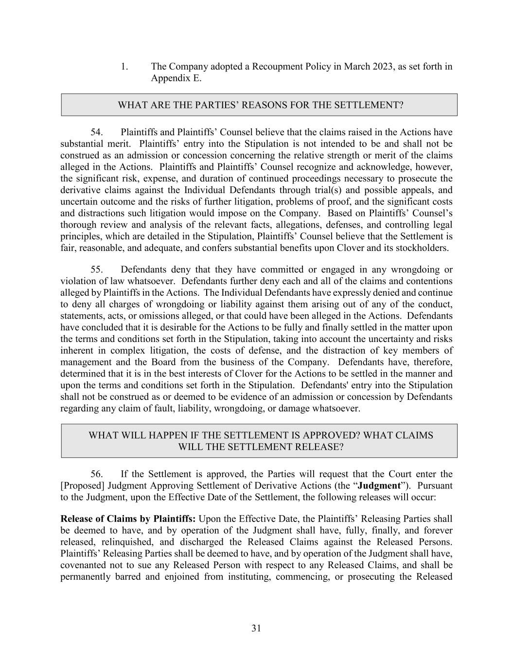 31 1. The Company adopted a Recoupment Policy in March 2023, as set forth in Appendix E. WHAT ARE THE PARTIES’ REASONS FOR THE SETTLEMENT? 54. Plaintiffs and Plaintiffs’ Counsel believe that the claims raised in the Actions have substantial merit. Plaintiffs’ entry into the Stipulation is not intended to be and shall not be construed as an admission or concession concerning the relative strength or merit of the claims alleged in the Actions. Plaintiffs and Plaintiffs’ Counsel recognize and acknowledge, however, the significant risk, expense, and duration of continued proceedings necessary to prosecute the derivative claims against the Individual Defendants through trial(s) and possible appeals, and uncertain outcome and the risks of further litigation, problems of proof, and the significant costs and distractions such litigation would impose on the Company. Based on Plaintiffs’ Counsel’s thorough review and analysis of the relevant facts, allegations, defenses, and controlling legal principles, which are detailed in the Stipulation, Plaintiffs’ Counsel believe that the Settlement is fair, reasonable, and adequate, and confers substantial benefits upon Clover and its stockholders. 55. Defendants deny that they have committed or engaged in any wrongdoing or violation of law whatsoever. Defendants further deny each and all of the claims and contentions alleged by Plaintiffs in the Actions. The Individual Defendants have expressly denied and continue to deny all charges of wrongdoing or liability against them arising out of any of the conduct, statements, acts, or omissions alleged, or that could have been alleged in the Actions. Defendants have concluded that it is desirable for the Actions to be fully and finally settled in the matter upon the terms and conditions set forth in the Stipulation, taking into account the uncertainty and risks inherent in complex litigation, the costs of defense, and the distraction of key members of management and the Board from the business of the Company. Defendants have, therefore, determined that it is in the best interests of Clover for the Actions to be settled in the manner and upon the terms and conditions set forth in the Stipulation. Defendants' entry into the Stipulation shall not be construed as or deemed to be evidence of an admission or concession by Defendants regarding any claim of fault, liability, wrongdoing, or damage whatsoever. WHAT WILL HAPPEN IF THE SETTLEMENT IS APPROVED? WHAT CLAIMS WILL THE SETTLEMENT RELEASE? 56. If the Settlement is approved, the Parties will request that the Court enter the [Proposed] Judgment Approving Settlement of Derivative Actions (the “Judgment”). Pursuant to the Judgment, upon the Effective Date of the Settlement, the following releases will occur: Release of Claims by Plaintiffs: Upon the Effective Date, the Plaintiffs’ Releasing Parties shall be deemed to have, and by operation of the Judgment shall have, fully, finally, and forever released, relinquished, and discharged the Released Claims against the Released Persons. Plaintiffs’ Releasing Parties shall be deemed to have, and by operation of the Judgment shall have, covenanted not to sue any Released Person with respect to any Released Claims, and shall be permanently barred and enjoined from instituting, commencing, or prosecuting the Released