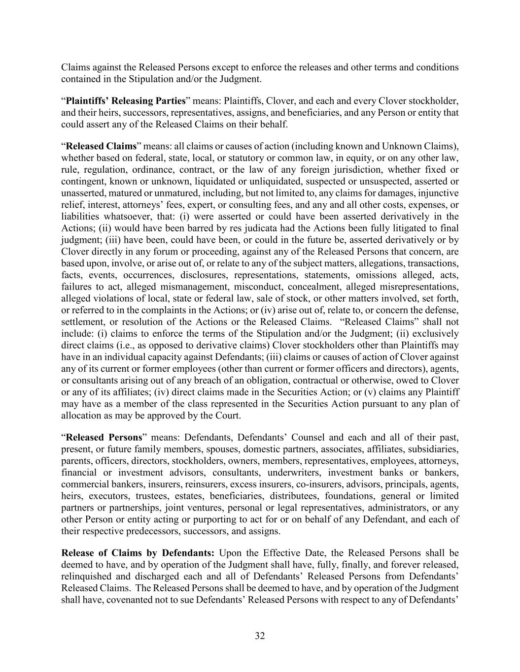 32 Claims against the Released Persons except to enforce the releases and other terms and conditions contained in the Stipulation and/or the Judgment. “Plaintiffs’ Releasing Parties” means: Plaintiffs, Clover, and each and every Clover stockholder, and their heirs, successors, representatives, assigns, and beneficiaries, and any Person or entity that could assert any of the Released Claims on their behalf. “Released Claims” means: all claims or causes of action (including known and Unknown Claims), whether based on federal, state, local, or statutory or common law, in equity, or on any other law, rule, regulation, ordinance, contract, or the law of any foreign jurisdiction, whether fixed or contingent, known or unknown, liquidated or unliquidated, suspected or unsuspected, asserted or unasserted, matured or unmatured, including, but not limited to, any claims for damages, injunctive relief, interest, attorneys’ fees, expert, or consulting fees, and any and all other costs, expenses, or liabilities whatsoever, that: (i) were asserted or could have been asserted derivatively in the Actions; (ii) would have been barred by res judicata had the Actions been fully litigated to final judgment; (iii) have been, could have been, or could in the future be, asserted derivatively or by Clover directly in any forum or proceeding, against any of the Released Persons that concern, are based upon, involve, or arise out of, or relate to any of the subject matters, allegations, transactions, facts, events, occurrences, disclosures, representations, statements, omissions alleged, acts, failures to act, alleged mismanagement, misconduct, concealment, alleged misrepresentations, alleged violations of local, state or federal law, sale of stock, or other matters involved, set forth, or referred to in the complaints in the Actions; or (iv) arise out of, relate to, or concern the defense, settlement, or resolution of the Actions or the Released Claims. “Released Claims” shall not include: (i) claims to enforce the terms of the Stipulation and/or the Judgment; (ii) exclusively direct claims (i.e., as opposed to derivative claims) Clover stockholders other than Plaintiffs may have in an individual capacity against Defendants; (iii) claims or causes of action of Clover against any of its current or former employees (other than current or former officers and directors), agents, or consultants arising out of any breach of an obligation, contractual or otherwise, owed to Clover or any of its affiliates; (iv) direct claims made in the Securities Action; or (v) claims any Plaintiff may have as a member of the class represented in the Securities Action pursuant to any plan of allocation as may be approved by the Court. “Released Persons” means: Defendants, Defendants’ Counsel and each and all of their past, present, or future family members, spouses, domestic partners, associates, affiliates, subsidiaries, parents, officers, directors, stockholders, owners, members, representatives, employees, attorneys, financial or investment advisors, consultants, underwriters, investment banks or bankers, commercial bankers, insurers, reinsurers, excess insurers, co-insurers, advisors, principals, agents, heirs, executors, trustees, estates, beneficiaries, distributees, foundations, general or limited partners or partnerships, joint ventures, personal or legal representatives, administrators, or any other Person or entity acting or purporting to act for or on behalf of any Defendant, and each of their respective predecessors, successors, and assigns. Release of Claims by Defendants: Upon the Effective Date, the Released Persons shall be deemed to have, and by operation of the Judgment shall have, fully, finally, and forever released, relinquished and discharged each and all of Defendants’ Released Persons from Defendants’ Released Claims. The Released Persons shall be deemed to have, and by operation of the Judgment shall have, covenanted not to sue Defendants’ Released Persons with respect to any of Defendants’