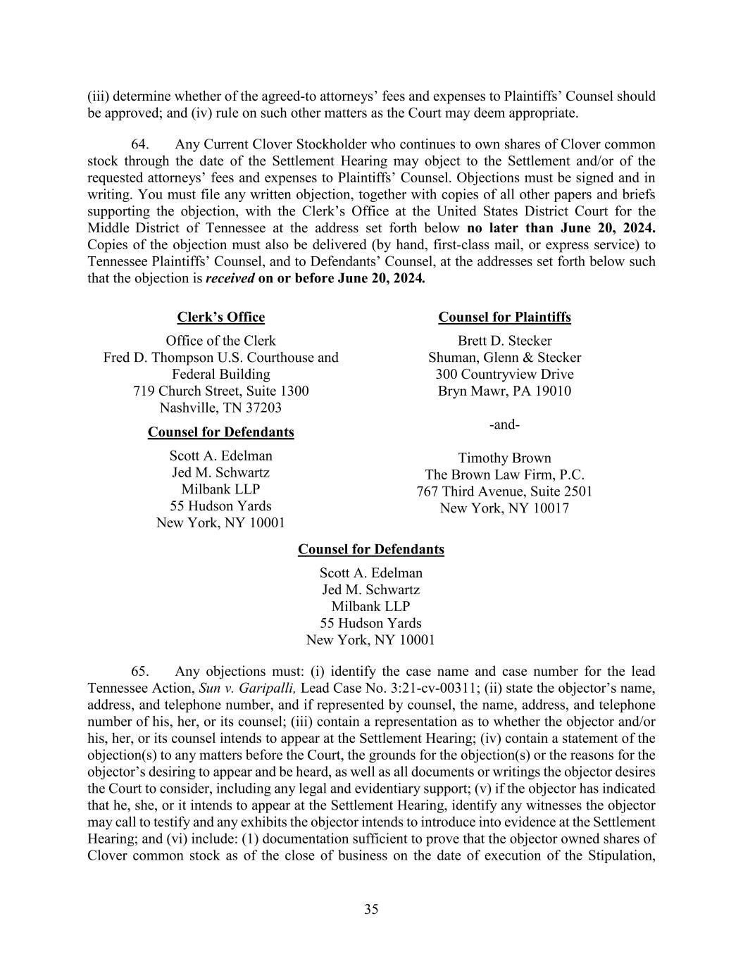 35 (iii) determine whether of the agreed-to attorneys’ fees and expenses to Plaintiffs’ Counsel should be approved; and (iv) rule on such other matters as the Court may deem appropriate. 64. Any Current Clover Stockholder who continues to own shares of Clover common stock through the date of the Settlement Hearing may object to the Settlement and/or of the requested attorneys’ fees and expenses to Plaintiffs’ Counsel. Objections must be signed and in writing. You must file any written objection, together with copies of all other papers and briefs supporting the objection, with the Clerk’s Office at the United States District Court for the Middle District of Tennessee at the address set forth below no later than June 20, 2024. Copies of the objection must also be delivered (by hand, first-class mail, or express service) to Tennessee Plaintiffs’ Counsel, and to Defendants’ Counsel, at the addresses set forth below such that the objection is received on or before June 20, 2024. Clerk’s Office Office of the Clerk Fred D. Thompson U.S. Courthouse and Federal Building 719 Church Street, Suite 1300 Nashville, TN 37203 Counsel for Defendants Scott A. Edelman Jed M. Schwartz Milbank LLP 55 Hudson Yards New York, NY 10001 Counsel for Plaintiffs Brett D. Stecker Shuman, Glenn & Stecker 300 Countryview Drive Bryn Mawr, PA 19010 -and- Timothy Brown The Brown Law Firm, P.C. 767 Third Avenue, Suite 2501 New York, NY 10017 Counsel for Defendants Scott A. Edelman Jed M. Schwartz Milbank LLP 55 Hudson Yards New York, NY 10001 65. Any objections must: (i) identify the case name and case number for the lead Tennessee Action, Sun v. Garipalli, Lead Case No. 3:21-cv-00311; (ii) state the objector’s name, address, and telephone number, and if represented by counsel, the name, address, and telephone number of his, her, or its counsel; (iii) contain a representation as to whether the objector and/or his, her, or its counsel intends to appear at the Settlement Hearing; (iv) contain a statement of the objection(s) to any matters before the Court, the grounds for the objection(s) or the reasons for the objector’s desiring to appear and be heard, as well as all documents or writings the objector desires the Court to consider, including any legal and evidentiary support; (v) if the objector has indicated that he, she, or it intends to appear at the Settlement Hearing, identify any witnesses the objector may call to testify and any exhibits the objector intends to introduce into evidence at the Settlement Hearing; and (vi) include: (1) documentation sufficient to prove that the objector owned shares of Clover common stock as of the close of business on the date of execution of the Stipulation,