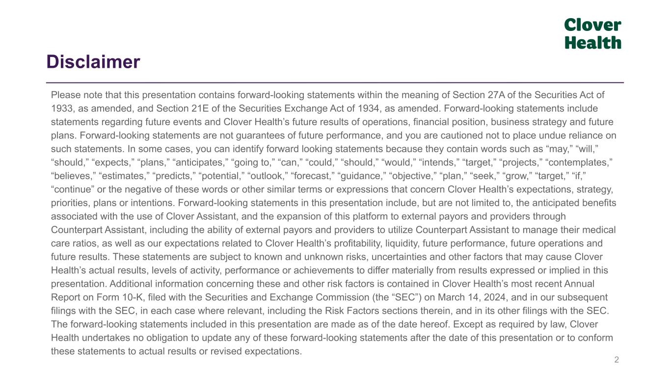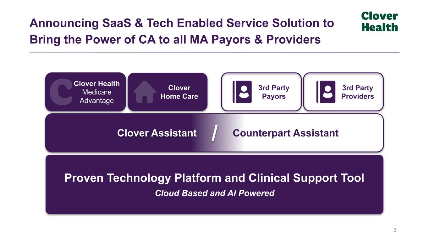 2 Disclaimer Please note that this presentation contains forward-looking statements within the meaning of Section 27A of the Securities Act of 1933, as amended, and Section 21E of the Securities Exchange Act of 1934, as amended. Forward-looking statements include statements regarding future events and Clover Health’s future results of operations, financial position, business strategy and future plans. Forward-looking statements are not guarantees of future performance, and you are cautioned not to place undue reliance on such statements. In some cases, you can identify forward looking statements because they contain words such as “may,” “will,” “should,” “expects,” “plans,” “anticipates,” “going to,” “can,” “could,” “should,” “would,” “intends,” “target,” “projects,” “contemplates,” “believes,” “estimates,” “predicts,” “potential,” “outlook,” “forecast,” “guidance,” “objective,” “plan,” “seek,” “grow,” “target,” “if,” “continue” or the negative of these words or other similar terms or expressions that concern Clover Health’s expectations, strategy, priorities, plans or intentions. Forward-looking statements in this presentation include, but are not limited to, the anticipated benefits associated with the use of Clover Assistant, and the expansion of this platform to external payors and providers through Counterpart Assistant, including the ability of external payors and providers to utilize Counterpart Assistant to manage their medical care ratios, as well as our expectations related to Clover Health’s profitability, liquidity, future performance, future operations and future results. These statements are subject to known and unknown risks, uncertainties and other factors that may cause Clover Health’s actual results, levels of activity, performance or achievements to differ materially from results expressed or implied in this presentation. Additional information concerning these and other risk factors is contained in Clover Health’s most recent Annual Report on Form 10-K, filed with the Securities and Exchange Commission (the “SEC”) on March 14, 2024, and in our subsequent filings with the SEC, in each case where relevant, including the Risk Factors sections therein, and in its other filings with the SEC. The forward-looking statements included in this presentation are made as of the date hereof. Except as required by law, Clover Health undertakes no obligation to update any of these forward-looking statements after the date of this presentation or to conform these statements to actual results or revised expectations.
