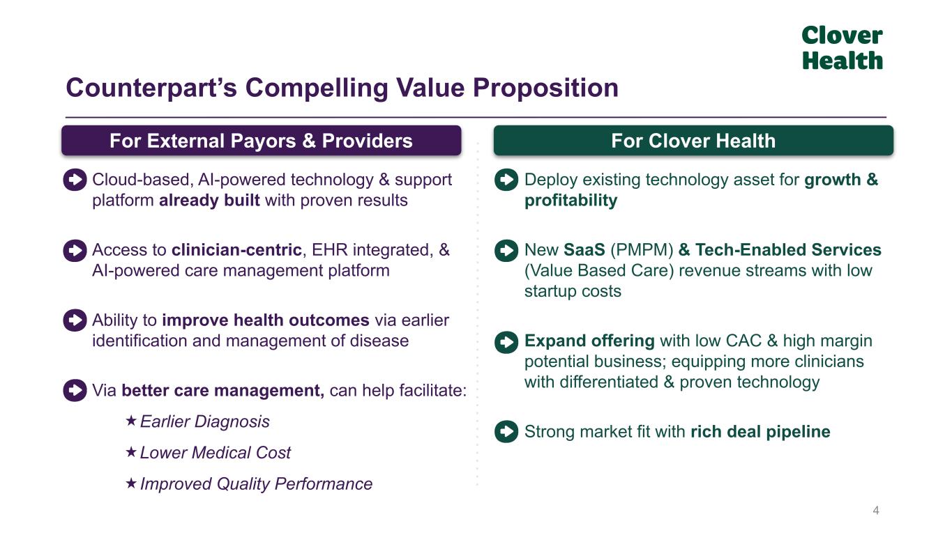 Announcing SaaS & Tech Enabled Service Solution to Bring the Power of CA to all MA Payors & Providers 3 Clover Home Care 3rd Party Payors 3rd Party Providers Clover Health Medicare Advantage Proven Technology Platform and Clinical Support Tool Cloud Based and AI Powered Counterpart AssistantClover Assistant /