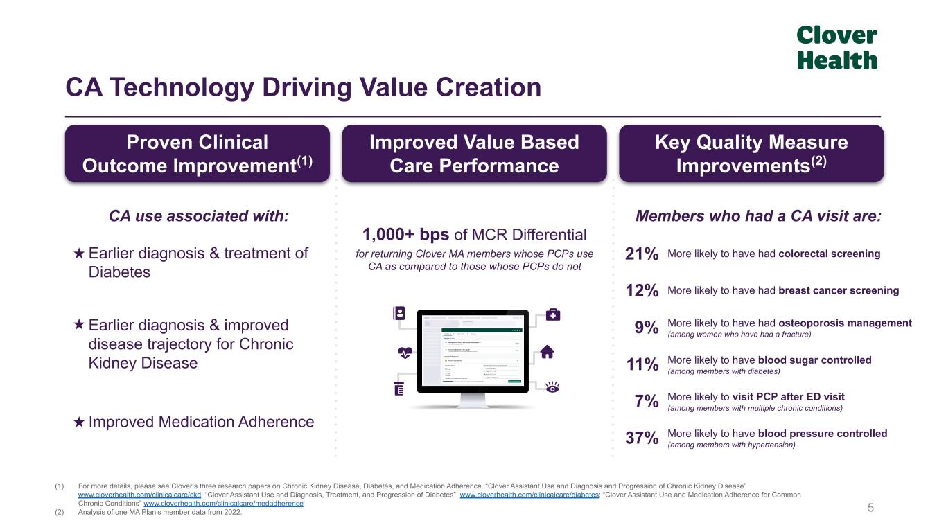 For Clover HealthFor External Payors & Providers Counterpart’s Compelling Value Proposition 4 Cloud-based, AI-powered technology & support platform already built with proven results Access to clinician-centric, EHR integrated, & AI-powered care management platform Ability to improve health outcomes via earlier identification and management of disease Via better care management, can help facilitate: Earlier Diagnosis Lower Medical Cost Improved Quality Performance Deploy existing technology asset for growth & profitability New SaaS (PMPM) & Tech-Enabled Services (Value Based Care) revenue streams with low startup costs Expand offering with low CAC & high margin potential business; equipping more clinicians with differentiated & proven technology Strong market fit with rich deal pipeline