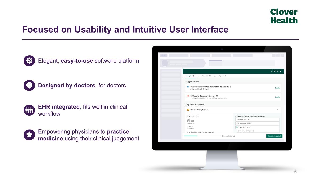 Earlier diagnosis & treatment of Diabetes 1,000+ bps of MCR Differential for returning Clover MA members whose PCPs use CA as compared to those whose PCPs do not 5 CA Technology Driving Value Creation (1) For more details, please see Clover’s three research papers on Chronic Kidney Disease, Diabetes, and Medication Adherence. “Clover Assistant Use and Diagnosis and Progression of Chronic Kidney Disease” www.cloverhealth.com/clinicalcare/ckd; “Clover Assistant Use and Diagnosis, Treatment, and Progression of Diabetes” www.cloverhealth.com/clinicalcare/diabetes; “Clover Assistant Use and Medication Adherence for Common Chronic Conditions” www.cloverhealth.com/clinicalcare/medadherence (2) Analysis of one MA Plan’s member data from 2022. Proven Clinical Outcome Improvement(1) Improved Value Based Care Performance Key Quality Measure Improvements(2) 21% 12% 11% 7% 37% 9% More likely to have had colorectal screening More likely to have had breast cancer screening More likely to have blood sugar controlled (among members with diabetes) More likely to visit PCP after ED visit (among members with multiple chronic conditions) More likely to have blood pressure controlled (among members with hypertension) More likely to have had osteoporosis management (among women who have had a fracture) Earlier diagnosis & improved disease trajectory for Chronic Kidney Disease Improved Medication Adherence Members who had a CA visit are:CA use associated with: