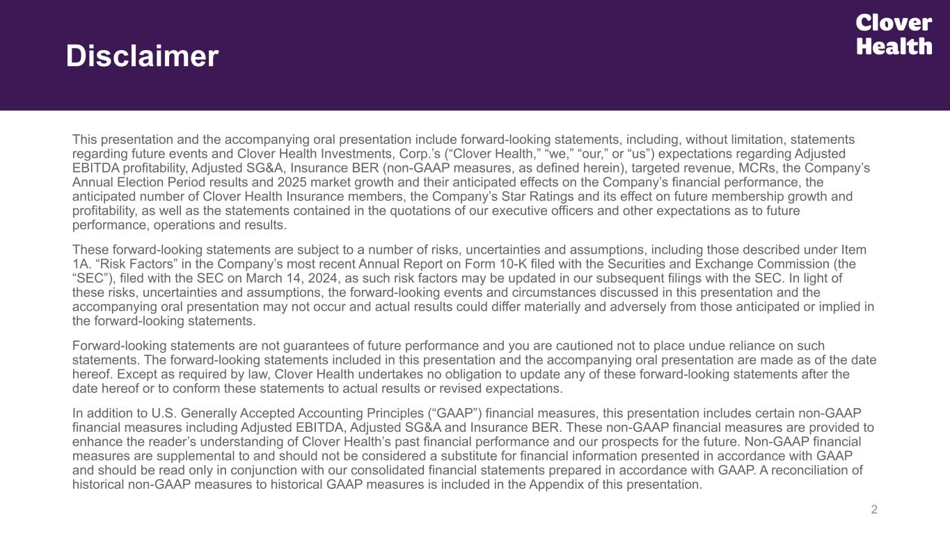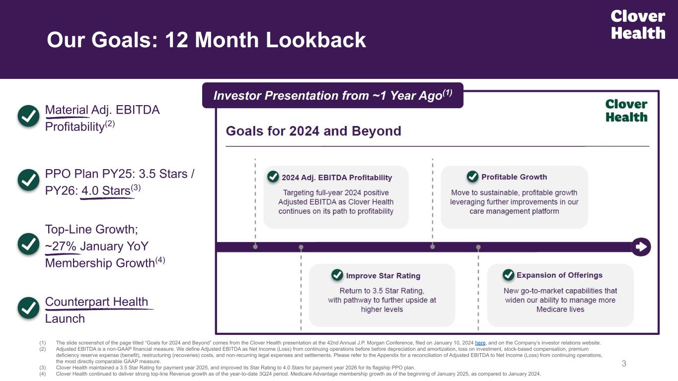 2 Disclaimer This presentation and the accompanying oral presentation include forward-looking statements, including, without limitation, statements regarding future events and Clover Health Investments, Corp.’s (“Clover Health,” “we,” “our,” or “us”) expectations regarding Adjusted EBITDA profitability, Adjusted SG&A, Insurance BER (non-GAAP measures, as defined herein), targeted revenue, MCRs, the Company’s Annual Election Period results and 2025 market growth and their anticipated effects on the Company’s financial performance, the anticipated number of Clover Health Insurance members, the Company’s Star Ratings and its effect on future membership growth and profitability, as well as the statements contained in the quotations of our executive officers and other expectations as to future performance, operations and results. These forward-looking statements are subject to a number of risks, uncertainties and assumptions, including those described under Item 1A. “Risk Factors” in the Company’s most recent Annual Report on Form 10-K filed with the Securities and Exchange Commission (the “SEC”), filed with the SEC on March 14, 2024, as such risk factors may be updated in our subsequent filings with the SEC. In light of these risks, uncertainties and assumptions, the forward-looking events and circumstances discussed in this presentation and the accompanying oral presentation may not occur and actual results could differ materially and adversely from those anticipated or implied in the forward-looking statements. Forward-looking statements are not guarantees of future performance and you are cautioned not to place undue reliance on such statements. The forward-looking statements included in this presentation and the accompanying oral presentation are made as of the date hereof. Except as required by law, Clover Health undertakes no obligation to update any of these forward-looking statements after the date hereof or to conform these statements to actual results or revised expectations. In addition to U.S. Generally Accepted Accounting Principles (“GAAP”) financial measures, this presentation includes certain non-GAAP financial measures including Adjusted EBITDA, Adjusted SG&A and Insurance BER. These non-GAAP financial measures are provided to enhance the reader’s understanding of Clover Health’s past financial performance and our prospects for the future. Non-GAAP financial measures are supplemental to and should not be considered a substitute for financial information presented in accordance with GAAP and should be read only in conjunction with our consolidated financial statements prepared in accordance with GAAP. A reconciliation of historical non-GAAP measures to historical GAAP measures is included in the Appendix of this presentation.