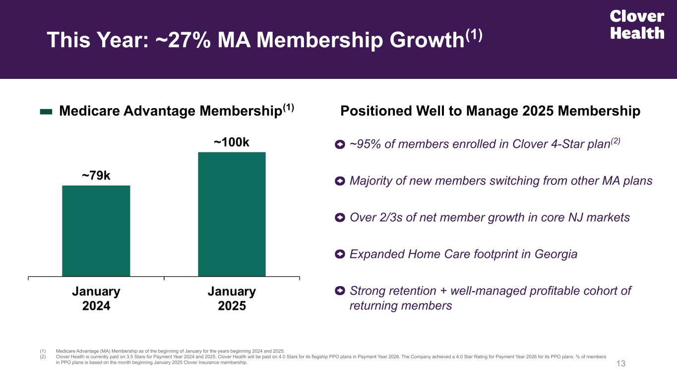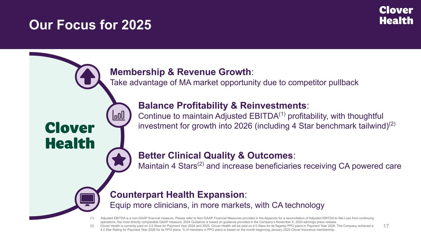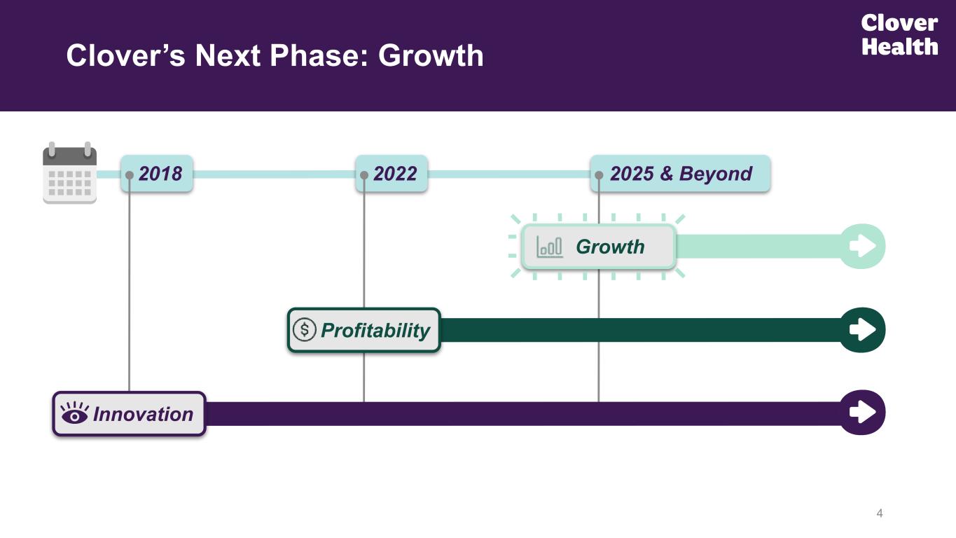 3 Investor Presentation from ~1 Year Ago(1) PPO Plan PY25: 3.5 Stars / PY26: 4.0 Stars(3) Counterpart Health Launch Our Goals: 12 Month Lookback (1) The slide screenshot of the page titled “Goals for 2024 and Beyond” comes from the Clover Health presentation at the 42nd Annual J.P. Morgan Conference, filed on January 10, 2024 here, and on the Company’s investor relations website. (2) Adjusted EBITDA is a non-GAAP financial measure. We define Adjusted EBITDA as Net Income (Loss) from continuing operations before before depreciation and amortization, loss on investment, stock-based compensation, premium deficiency reserve expense (benefit), restructuring (recoveries) costs, and non-recurring legal expenses and settlements. Please refer to the Appendix for a reconciliation of Adjusted EBITDA to Net Income (Loss) from continuing operations, the most directly comparable GAAP measure. (3) Clover Health maintained a 3.5 Star Rating for payment year 2025, and improved its Star Rating to 4.0 Stars for payment year 2026 for its flagship PPO plan. (4) Clover Health continued to deliver strong top-line Revenue growth as of the year-to-date 3Q24 period. Medicare Advantage membership growth as of the beginning of January 2025, as compared to January 2024. Material Adj. EBITDA Profitability(2) Top-Line Growth; ~27% January YoY Membership Growth(4)