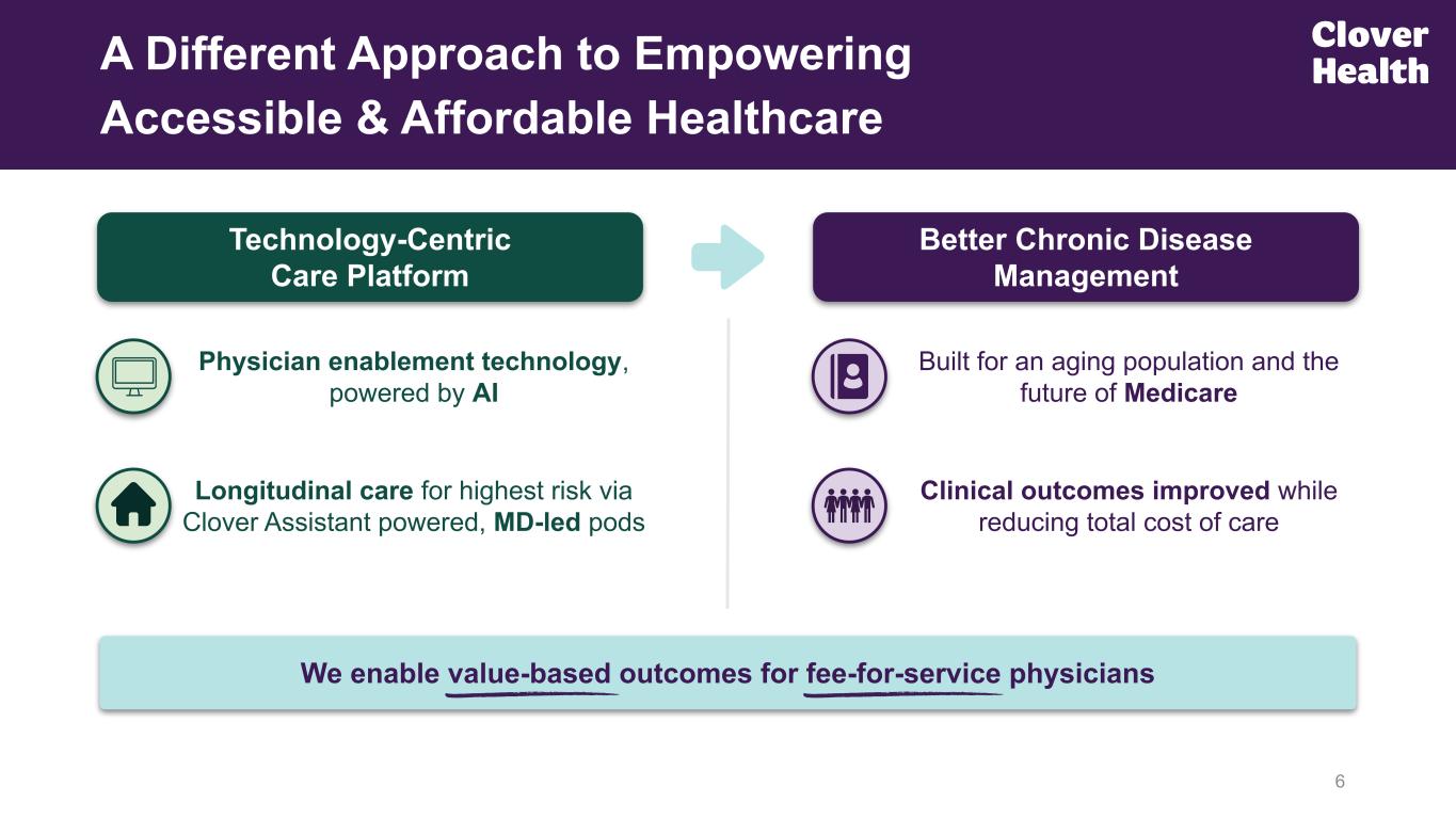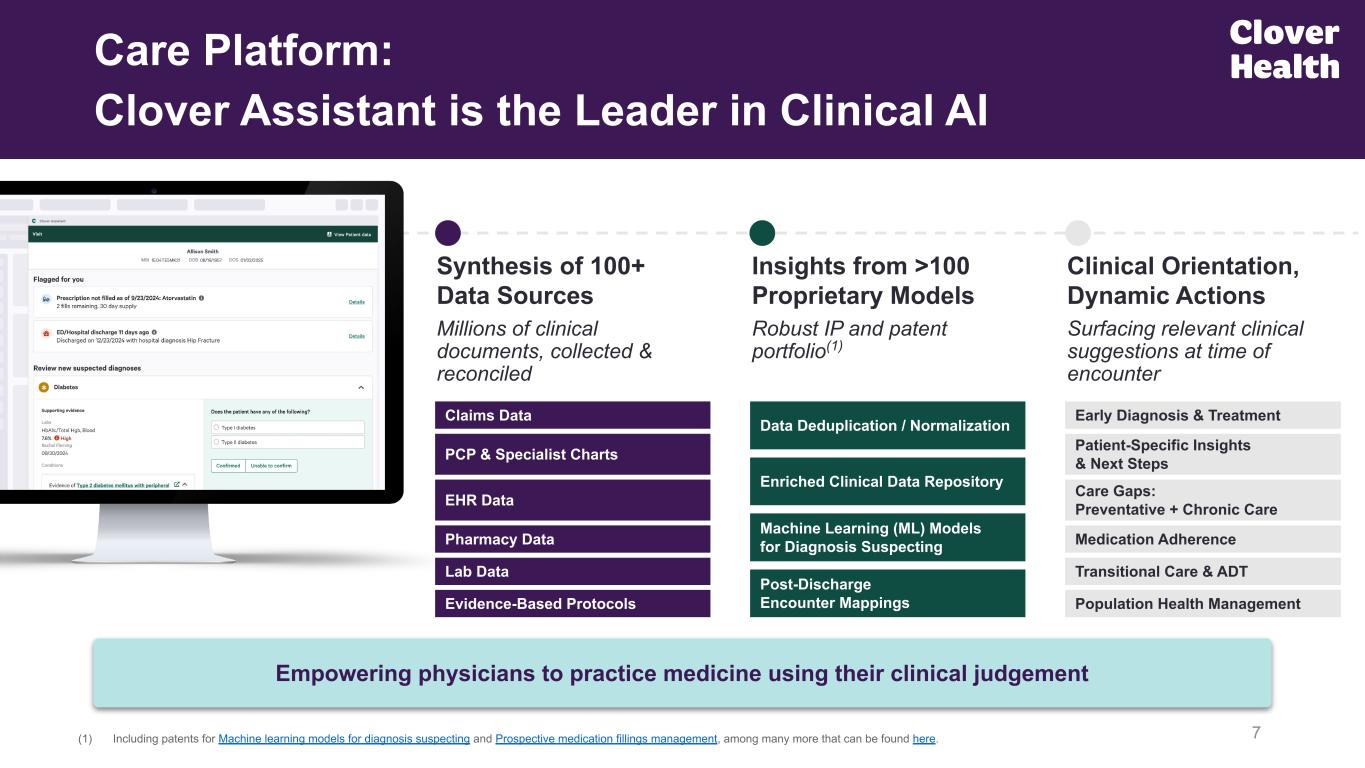 Physician enablement technology, powered by AI Longitudinal care for highest risk via Clover Assistant powered, MD-led pods 6 A Different Approach to Empowering Accessible & Affordable Healthcare Technology-Centric Care Platform We enable value-based outcomes for fee-for-service physicians Built for an aging population and the future of Medicare Clinical outcomes improved while reducing total cost of care Better Chronic Disease Management