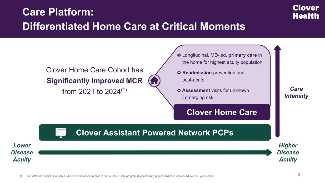 7 Care Platform: Clover Assistant is the Leader in Clinical AI Millions of clinical documents, collected & reconciled Synthesis of 100+ Data Sources Robust IP and patent portfolio(1) Insights from >100 Proprietary Models Surfacing relevant clinical suggestions at time of encounter Clinical Orientation, Dynamic Actions Claims Data PCP & Specialist Charts EHR Data Pharmacy Data Lab Data Evidence-Based Protocols Early Diagnosis & Treatment Patient-Specific Insights & Next Steps Care Gaps: Preventative + Chronic Care Medication Adherence Transitional Care & ADT Population Health Management Data Deduplication / Normalization Enriched Clinical Data Repository Post-Discharge Encounter Mappings Machine Learning (ML) Models for Diagnosis Suspecting (1) Including patents for Machine learning models for diagnosis suspecting and Prospective medication fillings management, among many more that can be found here. Empowering physicians to practice medicine using their clinical judgement