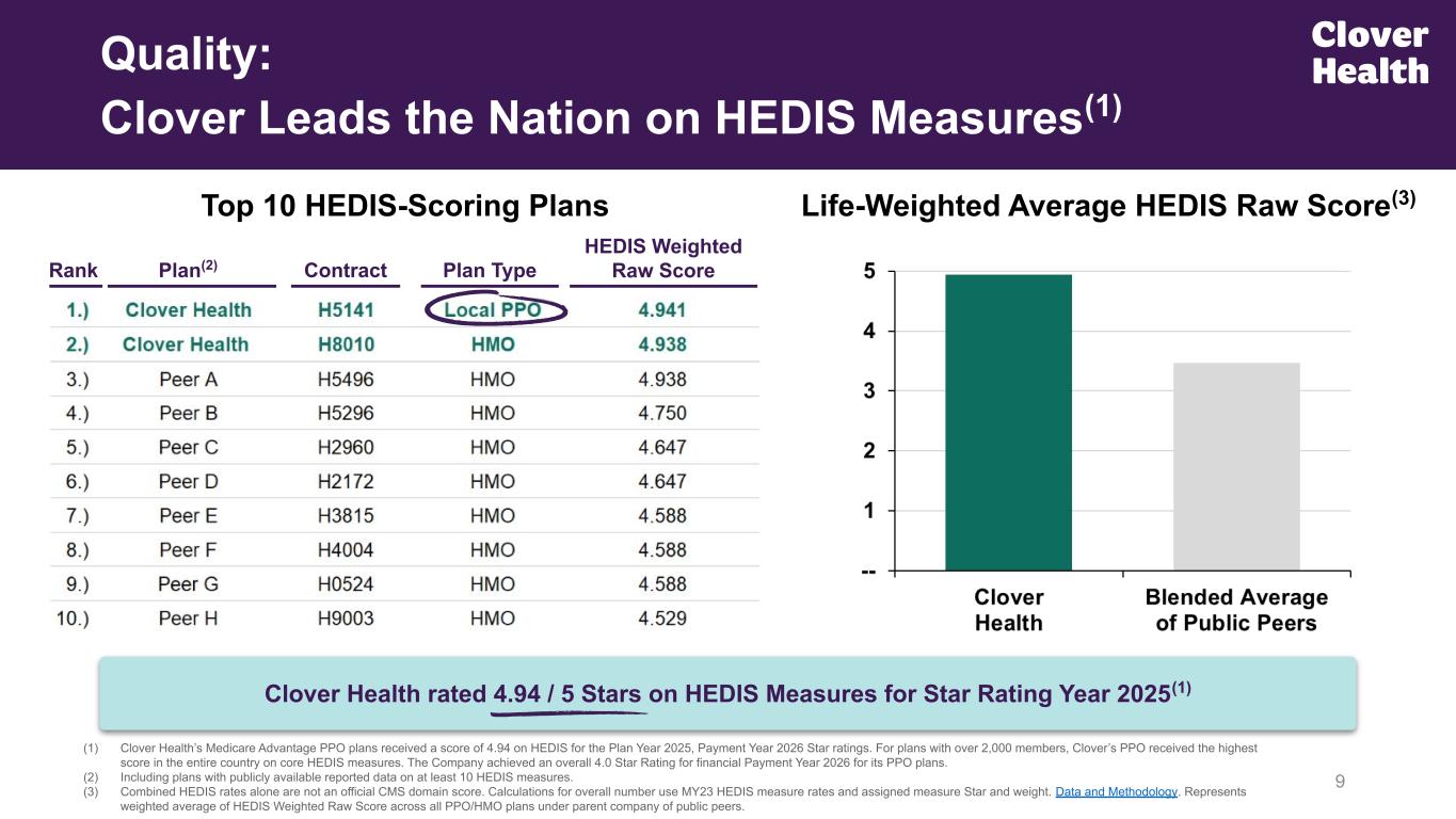 Clover Home Care Cohort has Significantly Improved MCR from 2021 to 2024(1) Care Platform: Differentiated Home Care at Critical Moments Higher Disease Acuity Lower Disease Acuity Clover Assistant Powered Network PCPs Care Intensity (1) Our data shows that since 2021, MCRs for members enrolled in our In-Home Care program (highest acuity population) have decreased over a 3 year period. Longitudinal, MD-led, primary care in the home for highest acuity population Readmission prevention and post-acute Assessment visits for unknown / emerging risk Clover Home Care 8