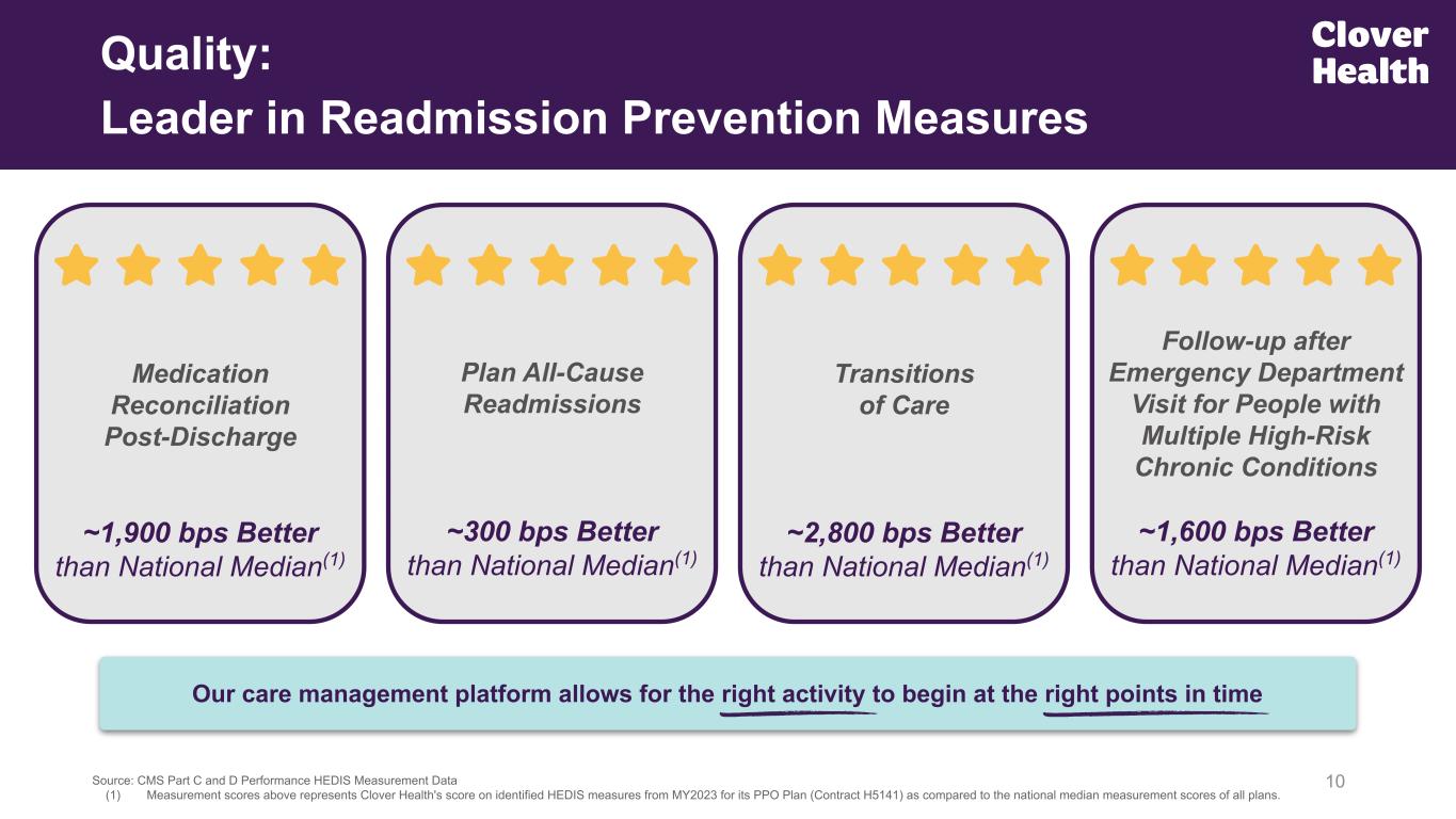Rank Quality: Clover Leads the Nation on HEDIS Measures(1) 9 (1) Clover Health’s Medicare Advantage PPO plans received a score of 4.94 on HEDIS for the Plan Year 2025, Payment Year 2026 Star ratings. For plans with over 2,000 members, Clover’s PPO received the highest score in the entire country on core HEDIS measures. The Company achieved an overall 4.0 Star Rating for financial Payment Year 2026 for its PPO plans. (2) Including plans with publicly available reported data on at least 10 HEDIS measures. (3) Combined HEDIS rates alone are not an official CMS domain score. Calculations for overall number use MY23 HEDIS measure rates and assigned measure Star and weight. Data and Methodology. Represents weighted average of HEDIS Weighted Raw Score across all PPO/HMO plans under parent company of public peers. Plan(2) Contract Plan Type HEDIS Weighted Raw Score Life-Weighted Average HEDIS Raw Score(3) Clover Health rated 4.94 / 5 Stars on HEDIS Measures for Star Rating Year 2025(1) Top 10 HEDIS-Scoring Plans