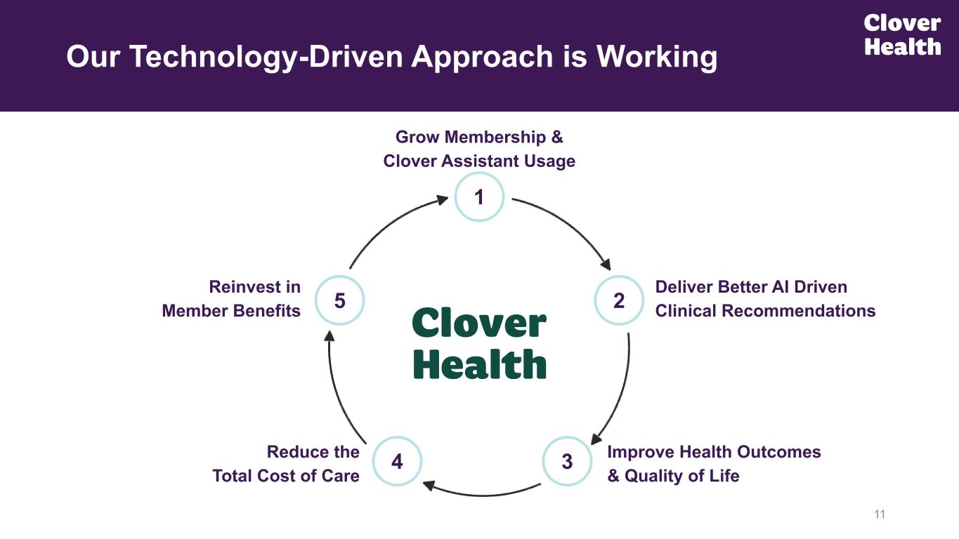 10 Quality: Leader in Readmission Prevention Measures Source: CMS Part C and D Performance HEDIS Measurement Data (1) Measurement scores above represents Clover Health's score on identified HEDIS measures from MY2023 for its PPO Plan (Contract H5141) as compared to the national median measurement scores of all plans. Medication Reconciliation Post-Discharge ~1,900 bps Better than National Median(1) Plan All-Cause Readmissions ~300 bps Better than National Median(1) Transitions of Care ~2,800 bps Better than National Median(1) Follow-up after Emergency Department Visit for People with Multiple High-Risk Chronic Conditions ~1,600 bps Better than National Median(1) Our care management platform allows for the right activity to begin at the right points in time