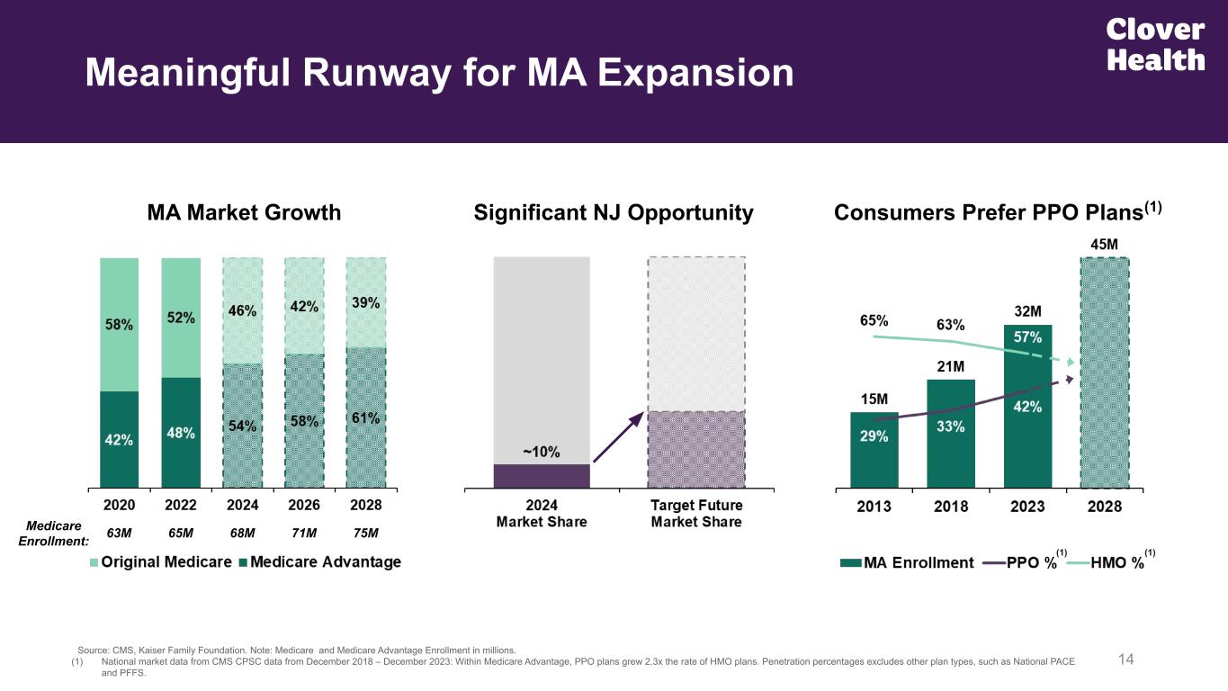 13 Medicare Advantage Membership(1) This Year: ~27% MA Membership Growth(1) (1) Medicare Advantage (MA) Membership as of the beginning of January for the years beginning 2024 and 2025. (2) Clover Health is currently paid on 3.5 Stars for Payment Year 2024 and 2025. Clover Health will be paid on 4.0 Stars for its flagship PPO plans in Payment Year 2026. The Company achieved a 4.0 Star Rating for Payment Year 2026 for its PPO plans. % of members in PPO plans is based on the month beginning January 2025 Clover Insurance membership. Positioned Well to Manage 2025 Membership ~95% of members enrolled in Clover 4-Star plan(2) Majority of new members switching from other MA plans Over 2/3s of net member growth in core NJ markets Expanded Home Care footprint in Georgia Strong retention + well-managed profitable cohort of returning members