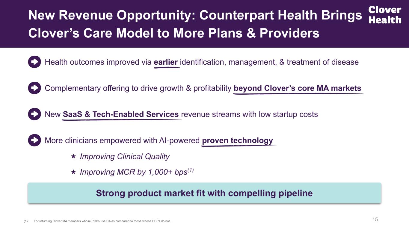 New Revenue Opportunity: Counterpart Health Brings Clover’s Care Model to More Plans & Providers 15(1) For returning Clover MA members whose PCPs use CA as compared to those whose PCPs do not. Strong product market fit with compelling pipeline Complementary offering to drive growth & profitability beyond Clover’s core MA markets Health outcomes improved via earlier identification, management, & treatment of disease More clinicians empowered with AI-powered proven technology New SaaS & Tech-Enabled Services revenue streams with low startup costs Improving Clinical Quality Improving MCR by 1,000+ bps(1)