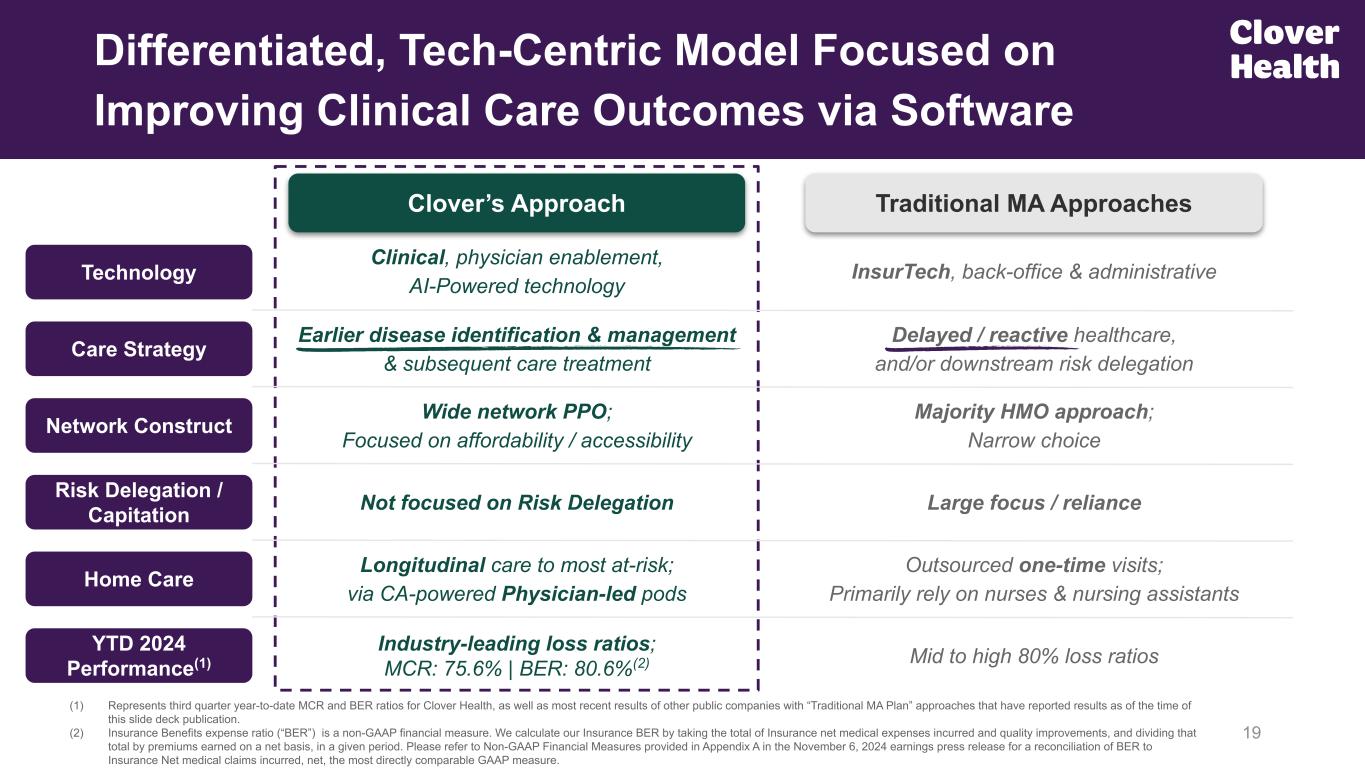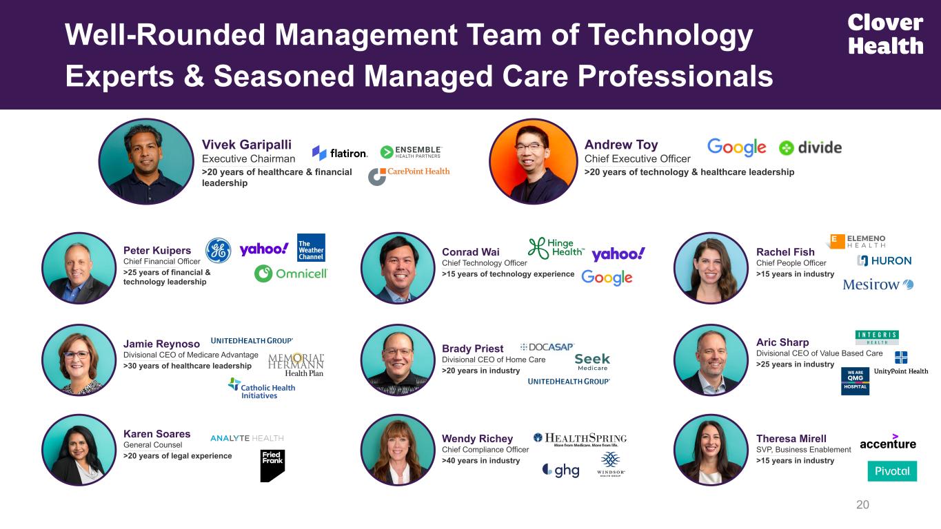 Longitudinal care to most at-risk; via CA-powered Physician-led pods Clover’s Approach Clinical, physician enablement, AI-Powered technology Earlier disease identification & management & subsequent care treatment Not focused on Risk Delegation Wide network PPO; Focused on affordability / accessibility Home Care Technology Differentiated, Tech-Centric Model Focused on Improving Clinical Care Outcomes via Software 19 Risk Delegation / Capitation Care Strategy (1) Represents third quarter year-to-date MCR and BER ratios for Clover Health, as well as most recent results of other public companies with “Traditional MA Plan” approaches that have reported results as of the time of this slide deck publication. (2) Insurance Benefits expense ratio (“BER”) is a non-GAAP financial measure. We calculate our Insurance BER by taking the total of Insurance net medical expenses incurred and quality improvements, and dividing that total by premiums earned on a net basis, in a given period. Please refer to Non-GAAP Financial Measures provided in Appendix A in the November 6, 2024 earnings press release for a reconciliation of BER to Insurance Net medical claims incurred, net, the most directly comparable GAAP measure. Network Construct Outsourced one-time visits; Primarily rely on nurses & nursing assistants Traditional MA Approaches InsurTech, back-office & administrative Delayed / reactive healthcare, and/or downstream risk delegation Large focus / reliance Majority HMO approach; Narrow choice Industry-leading loss ratios; MCR: 75.6% | BER: 80.6%(2) YTD 2024 Performance(1) Mid to high 80% loss ratios