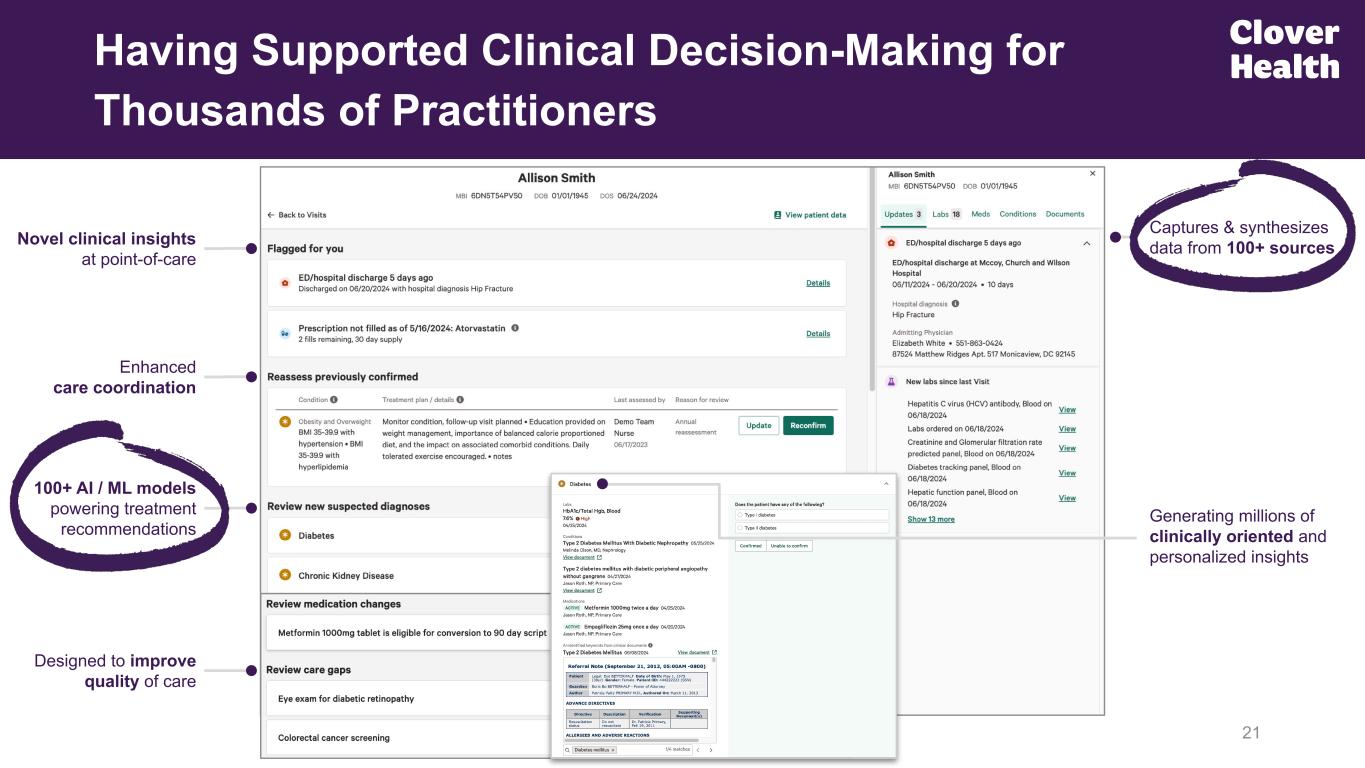 Designed to improve quality of care Having Supported Clinical Decision-Making for Thousands of Practitioners 21 Novel clinical insights at point-of-care Enhanced care coordination 100+ AI / ML models powering treatment recommendations Captures & synthesizes data from 100+ sources Generating millions of clinically oriented and personalized insights